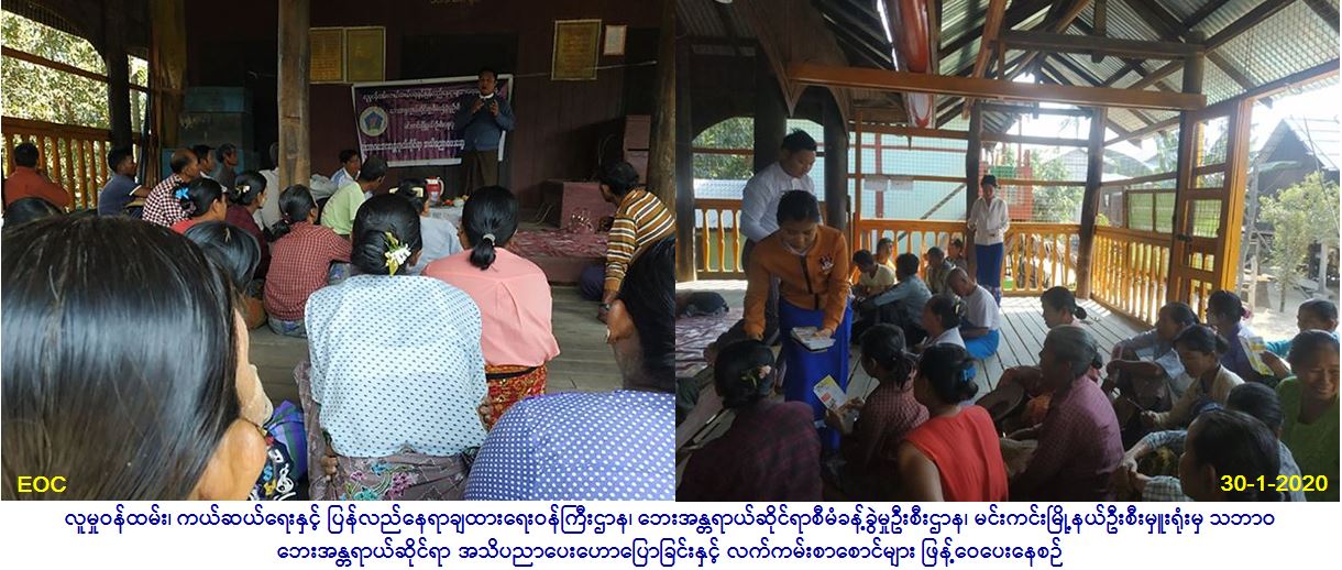 လူမှုဝန်ထမ်း၊ ကယ်ဆယ်ရေးနှင့် ပြန်လည်နေရာချထားရေးဝန်ကြီးဌာန၊ ဘေးအန္တရာယ်ဆိုင်ရာစီမံခန့်ခွဲမှုဦးစီးဌာန၊ မင်းကင်း မြို့နယ်ဦးစီးမှူးရုံးမှ တာဝန်ရှိသူများသည် (၃၀-၁-၂၀၂၀) ရက်နေ့၊ နေ့လည်(၁:၃၀)နာရီအချိန်တွင် မင်းကင်းမြို့နယ်၊ ကံကျေး ရွာရှိ ကျေးရွာသူ/သား (၆၁) ဦးအား သဘာဝဘေးအန္တရာယ်ဆိုင်ရာ အသိပညာပေးဆွေးနွေးဟောပြောပွဲပြုလုပ်ခဲ့ပါကြောင်း သတင်းရရှိပါသည်။