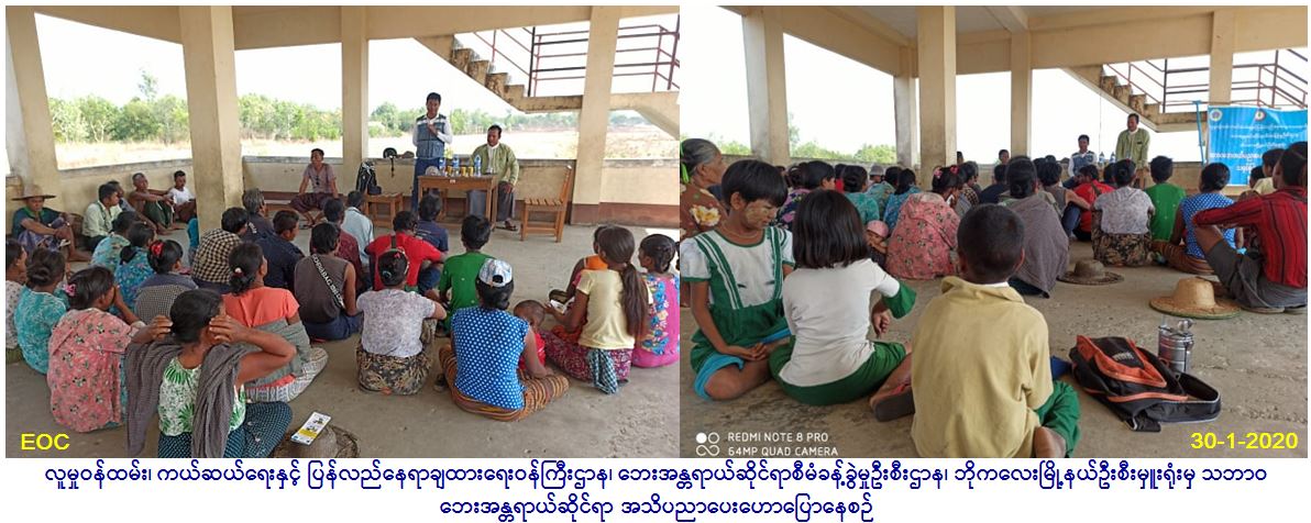 လူမှုဝန်ထမ်း ကယ်ဆယ်ရေးနှင့်ပြန်လည်နေရာချထားရေးဝန်ကြီးဌာန ဘေးအန္တရာယ်ဆိုင်ရာစီမံခန့်ခွဲမှုဦးစီးဌာန ဘိုကလေး မြို့နယ်ဦးစီးမှူးရုံးမှ တာဝန်ရှိသူများသည် (၃၀.၁.၂၀၂၀) ရက်နေ့၊ နံနက်(၁၂:၀၀)နာရီအချိန်ခန့်၌ ဘိုကလေးမြို့နယ် ချောင်းဗြဲ ကြီးကျေးရွာအုပ်စု ဂွေးချောင်းကြီးကျေးရွာတွင် သဘာဝဘေးအန္တရာယ်ဆိုင်ရာ အသိပညာပေး ဟောပြောပွဲ ကျင်းပပြုလုပ်ခဲ့ပြီး ရွာသူ/ ရွာသား(၁၀၀)ခန့်နှင့် အထွေထွေအုပ်ချုပ်ရေးဦးစီးဌာနမှ တာဝန်ရှိသူများတက်ရောက်ခဲ့ပီး အသိပညာ ပေးလက် ကမ်းစာစောင်များဖြန့်ဝေပေးခဲ့ပါကြောင်း သတင်းရရှိပါသည်။