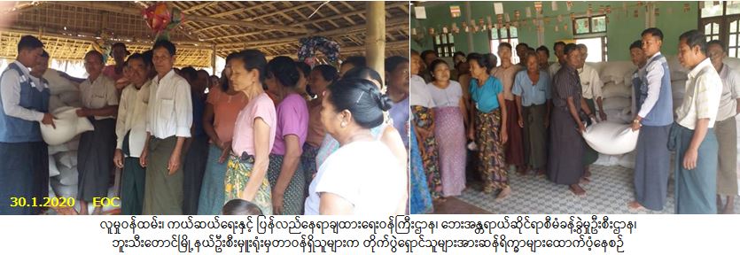 လူမှုဝန်ထမ်း၊ ကယ်ဆယ်ရေးနှင့် ပြန်လည်နေရာချထားရေးဝန်ကြီးဌာန၊ ဘေးအန္တရာယ်ဆိုင်ရာစီမံခန့်ခွဲမှုဦးစီး ဌာန၊ ဘူးသီးတောင်မြို့နယ်ဦးစီးမှူးရုံးမှတာဝန်ရှိသူများသည် (၃၀-၁-၂၀၂၀)ရက်နေ့တွင် ဘူးသီးတောင်မြို့၊ တောင်ရပ်ကွက်၊ ရန်အောင်မြေဘုန်းတော်ကြီးကျောင်းနှင့် မြို့မရပ်ကွက်၊ လမ်းမဘုန်းတော်ကြီးကျောင်း၊ စုရပ်စခန်း(၂)ခုတို့၌ ရိက္ခာထပ်မံလိုအပ်လျက်ရှိသည့် တိုက်ပွဲရှောင် အိမ်ထောင်စု(၆၀၉)စု၊ လူဦးရေ(၂၅၀၅)ဦးတို့အတွက် ဆန်ရိက္ခာ(၂)ပတ်စာ၊ ဆန်(၃၆၅)အိတ်၊ (၇)ပြည်၊ (၄)ဘူးတို့ကို ထောက်ပံ့ပေးအပ်ခဲ့ပါကြောင်း သတင်းရရှိပါသည်။