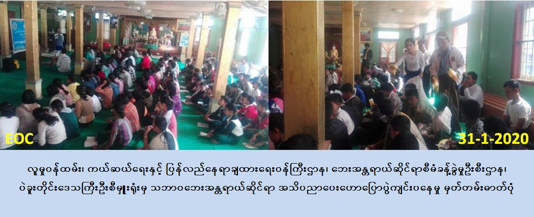 လူမှုဝန်ထမ်း၊ ကယ်ဆယ်ရေးနှင့် ပြန်လည်နေရာချထားရေးဝန်ကြီးဌာန၊ ဘေးအန္တရာယ် ဆိုင်ရာစီမံခန့်ခွဲမှုဦးစီးဌာန၊ ပဲခူးတိုင်းဒေသကြီးဦးစီမှူးရုံးမှ တာဝန်ရှိသူများသည် (၃၀-၁-၂၀၂၀) ရက်နေ့၊ (၁၁ : ၀၀) နာရီအချိန်မှ (၁၂ : ၃၀)နာရီအထိ သာယာဝတီခရိုင်၊ ကြို့ပင် ကောက်မြို့နယ်၊ ကျောက်ဝကျေးရွာအုပ်စု၊ အနောက်ရှားဖြူကုန်းကျေးရွာ၊ ရတနာမှန်ဘုန်း တော်ကြီးကျောင်းဓမ္မာရုံတွင် ကြို့ပင်ကောက်မြို့နယ် အထွေထွေအုပ်ချုပ်ရေးဦးစီးဌာနမှ တာဝန်ရှိသူများ၊ ကျေးရွာအုပ်ချုပ်ရေးမှူးများနှင့်အတူ ရပ်မိရပ်ဖများ၊ ကျေးရွာများအတွင်း ရှိပြည်သူများနှင့် အနောက်ရှားဖြူကုန်းကျေးရွာ၊ အထက်တန်းကျောင်းခွဲရှိ ဆရာ/ ဆရာမ များ၊ ကျောင်းသား / သူများ၊ စုစုပေါင်းတက်ရောက်လာသူ (၂၀၀) ဦး ကျော်တို့အား ဘေးမဖြစ်မီကြိုတင်ပြင်ဆင်ရေး၊ ဘေးဖြစ်စဉ်တုံ့ပြန်ဆောင်ရွက်ရေးနှင့် ဘေးဖြစ်ပြီး ဆောင်ရန်၊ ရှောင်ရန်များကို ဘေးအန္တရာယ်ဆိုင်ရာ အသိပညာပေးဆွေးနွေးဟောပြောခဲ့ပြီး ငလျင်ဘေးဗီနိုင်း ၊ရေဘေးဗီနိုင်း၊ (မီးဘေး၊ ရေဘေး၊ လေဘေးနှင့် ငလျင်ဘေးပိုစတာများ) အားရပ်ကွက်အုပ်ချုပ်ရေးမှူးနှင့် ဆရာ / ဆရာမများအားပေးအပ်ခြင်း ၊တက်ရောက်လာသူ များအား ငလျင်ဘေးယပ်တောင်၊ ငလျင်အသိပညာပေးစာအုပ်များ၊ လက်ကမ်းစာစောင် များနှင့် မုန့့်များဝေငှပေးခဲ့ကြောင်းသတင်းရရှိပါသည်။