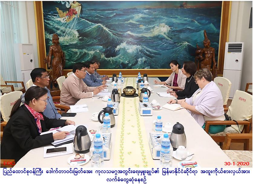 လူမှုဝန်ထမ်း၊ ကယ်ဆယ်ရေးနှင့်ပြန်လည်နေရာချထားရေးဝန်ကြီးဌာန ပြည်ထောင်စုဝန်ကြီး ဒေါက်တာဝင်းမြတ်အေး သည် ကုလသမဂ္ဂအတွင်းရေးမှူးချုပ်၏ မြန်မာနိုင်ငံဆိုင်ရာ အထူးကိုယ်စားလှယ် Ms. Christine Schraner Burgener ဦးဆောင် သောအဖွဲ့အား ယနေ့နံနက်ပိုင်းတွင် အဆိုပါဝန်ကြီးရုံး မေခလာခန်းမ၌ လက်ခံတွေ့ဆုံခဲ့ပါသည်။