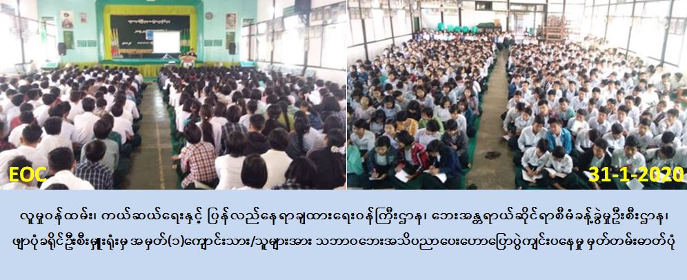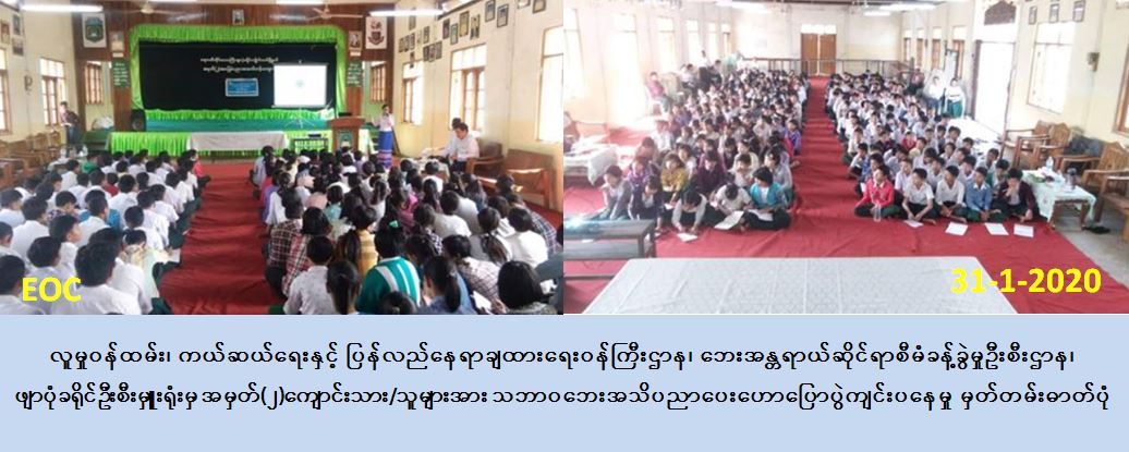 လူမှုဝန်ထမ်း၊ ကယ်ဆယ်ရေးနှင့် ပြန်လည်နေရာချထားရေးဝန်ကြီးဌာန၊ ဘေးအန္တရာယ် ဆိုင်ရာစီမံခန့်ခွဲမှုဦးစီးဌာန၊ ဖျာပုံခရိုင်ဦးစီးမှူးရုံးမှ တာဝန်ရှိသူများသည် (၃၀-၁-၂၀၂၀) ရက်နေ့တွင် ကျိုက်လတ်မြို့နယ်၊ အခြေခံပညာအထက်တန်းကျောင်း အမှတ်(၁) နှင့် အမှတ်(၂) ကျောင်းမှ ကျောင်းသား / သူ စုစုပေါင်း (၉၀၀) ဦးတို့အား သဘာဝဘေး အသိပညာပေးဟောပြောခြင်းနှင့် အသိပညာပေးလက်ကမ်းစာစောင် ဝေငှပေးခြင်းများကို ဆောင်ရွက်ခဲ့ပါကြောင်း သတင်းရရှိပါသည်။