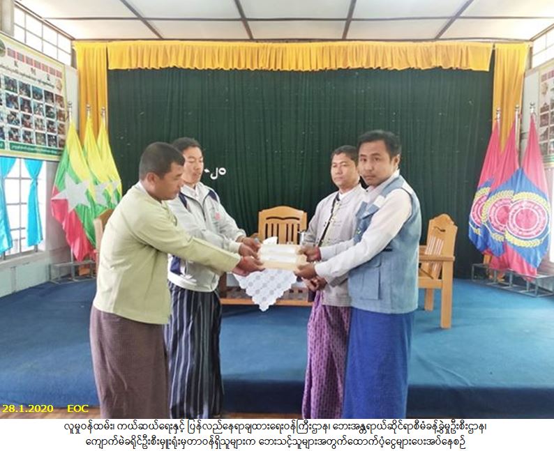 လူမှုဝန်ထမ်း၊ ကယ်ဆယ်ရေးနှင့် ပြန်လည်နေရာချထားရေးဝန်ကြီးဌာန၊ ဘေးအန္တရာယ်ဆိုင်ရာစီမံခန့်ခွဲမှုဦးစီး ဌာန၊ ကျောက်မဲခရိုင်ဦးစီးမှူးရုံးမှတာဝန်ရှိသူများသည် ကျောက်မဲမြို့နယ်၊ မိုင်းလုံမြို့၊ ညောင်မောင်း ကျေးရွာအုပ်စု၊ ညောင်မောင်းကျေးရွာအတွင်း၌ (၂၈-၁-၂၀၂၀)ရက်နေ့တွင် လက်နက်ကြီးကျရောက်ထိမှန်၍ ပျက်စီးနေအိမ်(၈)လုံးအတွက် အိမ်ဆောက်ပစ္စည်းဖိုးထောက်ပံ့ငွေ(၇၂၀,၀၀ဝ/-) ကျပ်၊ လူဦးရေ(၃၃)ဦးအတွက် ဆန်ရိက္ခာ(၇)ရက်စာဖိုးထောက်ပံ့ငွေ (၆၉,၃၀ဝ/-) ကျပ်နှင့် ဘေးသင့်သေဆုံးသူ(၂)ဦးအတွက် သေဆုံးထောက်ပံ့ငွေ (၆၀၀,၀၀ဝ/-) ကျပ်တို့ကို (၃၁-၁-၂၀၂၀)ရက်နေ့၊ (၁၀:၃၀)နာရီအချိန်တွင် ကျောက်မဲမြို့နယ်အုပ်ချုပ်ရေးမှူးနှင့်အတူ ထောက်ပံ့ပေးအပ်ခဲ့ပါကြောင်း သတင်းရရှိပါသည်။