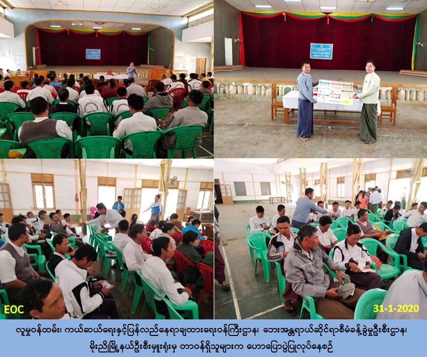 လူမှုဝန်ထမ်း၊ ကယ်ဆယ်ရေးနှင့် ပြန်လည်နေရာချထားရေးဝန်ကြီးဌာန၊ ဘေးအန္တရာယ် ဆိုင်ရာစီမံခန့်ခွဲမှုဦးစီးဌာန၊ မိုးညိုမြို့နယ်ဦးစီးမှူးရုံးမှ တာဝန်ရှိသူများသည် ပဲခူးတိုင်း ဒေသကြီး၊ သာယာဝတီခရိုင်၊ လက်ပံတန်းမြို့နယ်၊ မြို့နယ်ခန်းမ၌ (၃၁-၁-၂၀၂၀) ရက်နေ့ (၁၁:၀၀) နာရီအချိန်မှ (၁၂:၃၀) နာရီအချိန်ထိ သဘာဝဘေးအန္တရာယ်နှင့် စပ်လျဉ်း၍ ဆောင်ရန်၊ ရှောင်ရန်များအား အသိပညာပေးဟောပြောခြင်း၊ ပိုစတာများ၊ ဗီနိုင်းများ၊ ငလျင်ယပ်တောင်များ၊ ငလျင်ဇာတ်တိုက်စာအုပ်များ၊ ငလျင်ရုပ်ပြစာအုပ်များနှင့် လက်ကမ်း စာစောင်များဖြန့်ဝေခြင်းတို့ပြုလုပ်ခဲ့ရာ ဒုတိယမြို့နယ်အုပ်ချုပ်ရေးမှူးနှင့် မြို့နယ်အဆင့် ဌာနဆိုင်ရာများ၊ ကျေးရွာအုပ်ချူပ်ရေးမှူးများနှင့် ကျေးလက်စာရေး (၁၅၀) ဦးခန့်တက် ရောက်ခဲ့ပါကြောင်း သတင်းရရှိပါသည်။