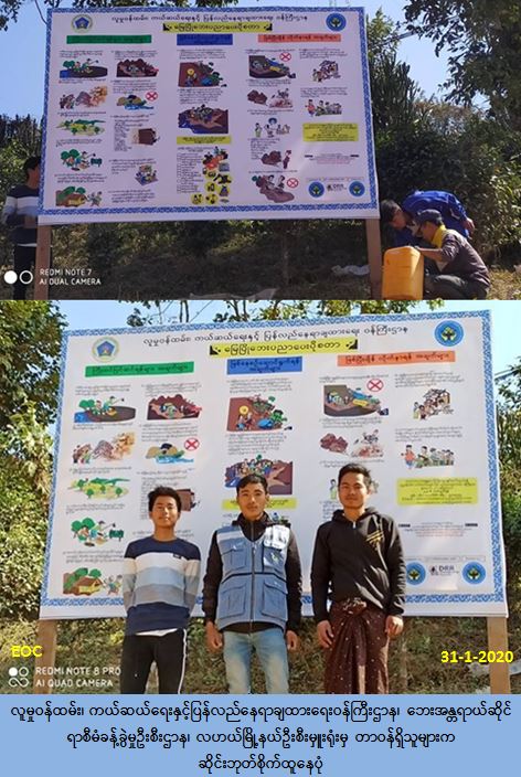 လူမှုဝန်ထမ်း၊ ကယ်ဆယ်ရေးနှင့် ပြန်လည်နေရာချထားရေးဝန်ကြီးဌာန၊ ဘေးအန္တရာယ် ဆိုင်ရာစီမံခန့်ခွဲမှုဦးစီးဌာန၊ လဟယ်မြို့နယ်ဦးစီးမှူးရုံးမှ တာဝန်ရှိသူများသည် (၃၀-၁-၂၀၂၀) ရက်နေ့ မြေပြိုဘေး အသိပညာပေး ဆိုင်းဘုတ်စိုက်ထူပြီးစီးခဲ့ပါကြောင်း သတင်းရ ရှိပါသည်။