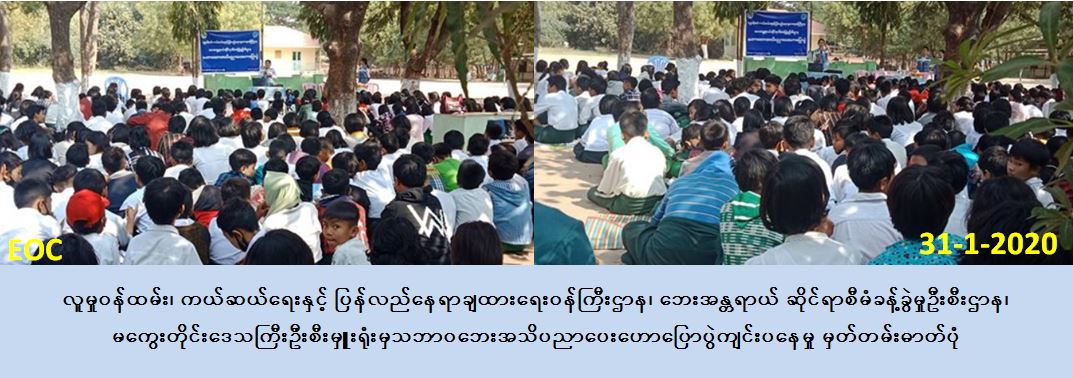 လူမှုဝန်ထမ်း၊ ကယ်ဆယ်ရေးနှင့် ပြန်လည်နေရာချထားရေးဝန်ကြီးဌာန၊ ဘေးအန္တရာယ် ဆိုင်ရာစီမံခန့်ခွဲမှုဦးစီးဌာန၊ မကွေးတိုင်းဒေသကြီးဦးစီးမှူးရုံးမှ တာဝန်ရှိသူများသည် ( ၃၁ -၁-၂၀၂၀ ) ရက်နေ့၊ ( ၁၃ : ၀၀ ) နာရီအချိန်တွင် မကွေးမြို့၊ အ.လ.က ကန်သာကျောင်း၌ ဆရာ / ဆရာမများနှင့် ကျောင်းသား / ကျောင်းသူ (၃၅၀) ဦးခန့်အား သဘာဝဘေး စီမံခန့်ခွဲမှုလုပ်ငန်းစဉ်များအကြောင်းနှင့် သဘာဝဘေးနှင့်ပတ်သက်သည့် ဆောင်ရန် / ရှောင်ရန်အကြောင်အရာများအား ဟောပြောပို့ချခြင်းနှင့် သဘာဝဘေးလက်ကမ်းစာစောင် များ ဖြန့်ဝေပေးခဲ့ပါကြောင်း သတင်းရရှိပါသည်။