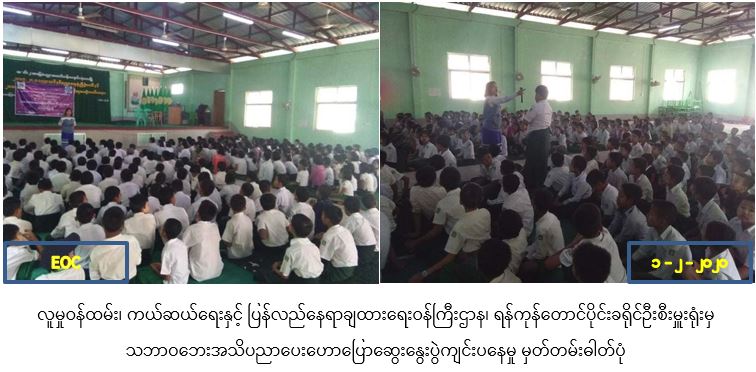 လူမှုဝန်ထမ်း၊ ကယ်ဆယ်ရေးနှင့် ပြန်လည်နေရာချထားရေးဝန်ကြီးဌာန၊ ဘေးအန္တရာယ်ဆိုင်ရာစီမံခန့်ခွဲမှုဦးစီး ဌာန၊ ရန်ကုန်တောင်ပိုင်းခရိုင်ဦးစီးမှူးရုံးမှတာဝန်ရှိသူများသည် (၃၁-၁-၂၀၂၀) ရက်နေ့၊ (၁၃:၀၀) နာရီ အချိန်တွင် တွံတေးမြို့နယ်၊ အ.ထ.က(၂)၌ သဘာဝဘေးအန္တရာယ်မြေငလျင်နှင့် ပတ်သက်သော ဆောင်ရန်/ ရှောင်ရန်များအား ဆောင်ရွက်နိုင်စေရန်အတွက် ဆရာ/ဆရာမနှင့် ကျောင်းသူ/ကျောင်းသား (၄၀ဝ)ဦးခန့်အား သဘာဝဘေးအန္တရာယ်နှင့်ပတ်သက်၍ အသိပညာပေးဟောပြောပွဲ ကျင်းပပြုလုပ်ခဲ့ပြီး သဘာဝဘေးအသိပညာပေး လက်ကမ်းစာစောင်များအား ဖြန့်ဝေပေးခဲ့ပါကြောင်း သတင်းရရှိပါသည်။