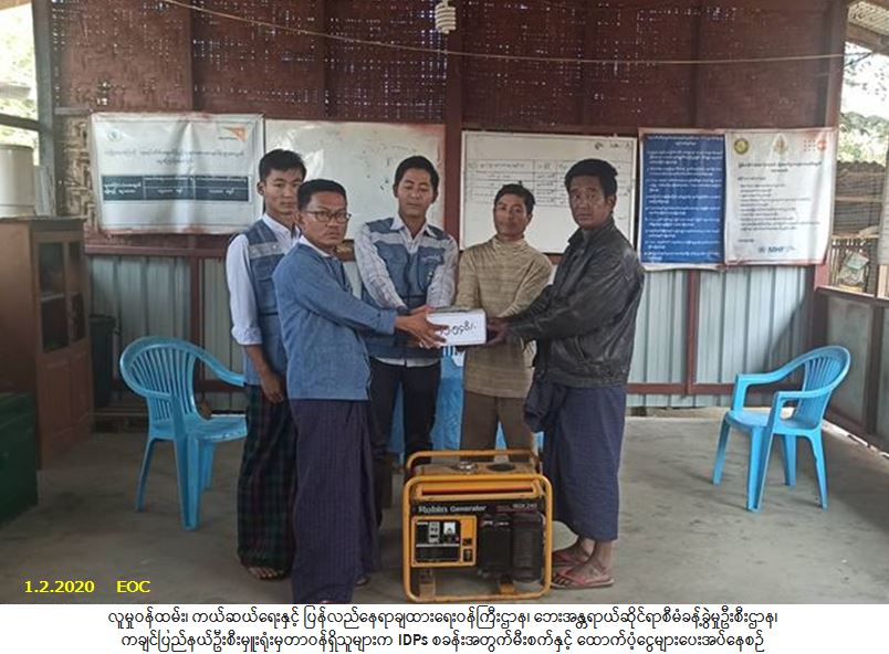 လူမှုဝန်ထမ်း၊ ကယ်ဆယ်ရေးနှင့် ပြန်လည်နေရာချထားရေးဝန်ကြီးဌာန၊ ဘေးအန္တရာယ်ဆိုင်ရာစီမံခန့်ခွဲမှုဦးစီး ဌာန၊ ကချင်ပြည်နယ်ဦးစီးမှူးရုံးမှတာဝန်ရှိသူများသည် မြစ်ကြီးနားခရိုင်၊ ဝိုင်းမော်မြို့နယ်၊ နောင်ဟီးကျေးရွာရှိ IDPsစခန်းသို့ Robin မီးစက်(၁)လုံးကိုလည်းကောင်း၊ မိလ္လာအဆောက်အဦ (အိမ်သာ)ဆောက်လုပ်ရန် ကုန်ကျငွေ (၈၄၅,၅၄၀/-) ကျပ်ကိုလည်းကောင်း (၁-၂-၂၀၂၀)ရက်နေ့၊ (၁၂:၁၅)နာရီအချိန်တွင် သွားရောက် ထောက်ပံ့ ပေးအပ်ခဲ့ပါကြောင်း သတင်းရရှိပါသည်။