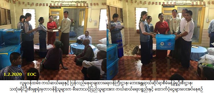 လူမှုဝန်ထမ်း၊ ကယ်ဆယ်ရေးနှင့် ပြန်လည်နေရာချထားရေးဝန်ကြီးဌာန၊ ဘေးအန္တရာယ်ဆိုင်ရာစီမံခန့်ခွဲမှုဦးစီး ဌာန၊ သထုံခရိုင်ဦးစီးမှူးရုံးမှတာဝန်ရှိသူများသည် ပြည်သူ့လွတ်တော်ကိုယ်စားလှယ်၊ သုဝဏ္ဏဝတီမြို့ အုပ်ချုပ်ရေးမှူးတို့နှင့်အတူ သထုံမြို့နယ်၊ သုဝဏ္ဏဝတီမြို့၊ သိမ်ဆိပ်ရပ်ကွက်၊ မင်းတဲစုပိုင်း မီးရထားလမ်းအနောက်ဘက်(ကျူးကျော်)၌ (၁-၂-၂၀၂၀)ရက်နေ့၊ (၀၁:၀၀)နာရီအချိန်တွင် ဖြစ်ပွားခဲ့သော မီးဘေးကြောင့် ပျက်စီးနေအိမ် (၁၁)လုံးအတွက် ကယ်ဆယ်ရေးပစ္စည်း (၁၇)မျိုး (၄)အိမ်ထောင်စုစာနှင့် ကယ်ဆယ်ရေးပစ္စည်း(၁၆)မျိုး (၇)အိမ်ထောင်စုစာကိုလည်းကောင်း၊ လူဦးရေ (၅၁)ဦး အတွက် ဆန်ရိက္ခာ (၇)ရက်စာဖိုးထောက်ပံ့ငွေ (၁၀၇,၁၀၀/-) ကျပ်ကိုလည်းကောင်း မင်းတဲစုရပ်ကွက်၊ အောင်ဇဗ္ဗူဘုန်းကြီးကျောင်း၌ (၁-၂-၂၀၂၀)ရက်နေ့၊ (၁၁:၀၀)အချိန်တွင် ထောက်ပံ့ပေးအပ်ခဲ့ပါကြောင်း သတင်းရရှိပါသည်။