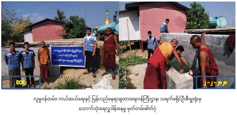 လူမှုဝန်ထမ်း၊ ကယ်ဆယ်ရေးနှင့်ပြန်လည်နေရာချထားရေးဝန်ကြီးဌာန၊ ဘေးအန္တရာယ်ဆိုင်ရာ စီမံခန့်ခွဲမှုဦးစီးဌာန၊ သရက်ခရိုင်ဦးစီးမှူးရုံးမှ တာဝန်ရှိသူများသည် (၁-၂-၂၀၂၀)ရက်နေ့၊ မွန်းလွဲ(၁၂:၀၀)အချိန်တွင် သောက်သုံးရေ အခက်အခက်အခဲဖြစ်ပေါ်နေသော သရက်မြို့နယ်၊ ပိတောက်ပင်ကျေးရွာအုပ်စု၊ ငလှိုင်ခြုံရေနံနယ်မြေ၊ တောရကျောင်းဘုရားကုန်းရပ်ရှိ ဘုန်းတော်ကြီးကျောင်းသို့ သောက်သုံးရေဂါလံ(၃၂၀၀)ကို ရေသယ်ယာဥ်ဖြင့် သွားရောက်လှူဒါန်းခဲ့ကြောင်း သတင်းရရှိပါသည်။
