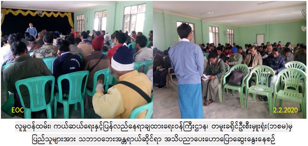 လူမှုဝန်ထမ်း၊ ကယ်ဆယ်ရေးနှင့်ပြန်လည်နေရာချထားရေးဝန်ကြီးဌာန၊ ဘေးအန္တရာယ်ဆိုင်ရာစီမံခန့်ခွဲမှုဦးစီးဌာန၊ တမူးခရိုင်ဦးစီးမှူးရုံးမှ (၃၁.၁.၂၀၂၀)နေ့ နံနက်ပိုင်းတွင် မြို့နယ်အထွေထွေအုပ်ချုပ်ရေးဦးစီးဌာနအစည်းအဝေးခန်းမတွင် ရပ်ကွက်/ကျေးရွာ အုပ်ချုပ်ရေးမှူးနှင့် ရပ်/ကျေး စာရေးဝန်ထမ်း စုစုပေါင်း(၆၀)ဦးခန့်အား သဘာဝဘေးအန္တရာယ်ဆိုင်ရာအသိပညာများဟောပြောဆွေးနွေးခဲ့ပြီး လက်ကမ်းစာစောင်နှင့် နံရံကပ်ပိုစတာများဖြန့်ဝေပေးခဲ့ကြောင်း သတင်းရရှိပါသည်။