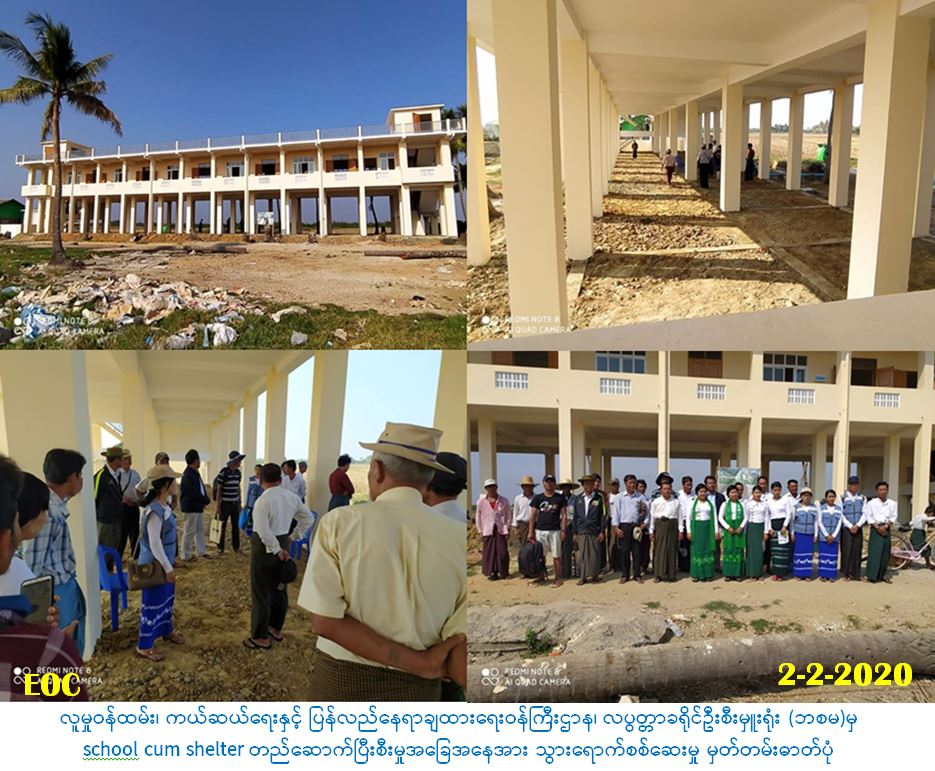 လူမှုဝန်ထမ်း၊ ကယ်ဆယ်နှင့်ပြန်လည်နေရာချထားရေးဝန်ကြီးဌာန၊ ဘေးအန္တရာယ်ဆိုင်ရာ စီမံခန့်ခွဲမှုဦးစီးဌာန၊ လပွတ္တာခရိုင်ဦးစီးမှူးရုံးမှ တာဝန်ရှိသူများသည် (၂-၂-၂၀၂၀) ရက်နေ့၌ လွှတ်တော်ကိုယ်စားလှယ်ရုံးမှတာဝန်ရှိသူများ၊ မြို့နယ်ဆောက်လုပ်ရေးကြီးကြပ်မှုကော်မတီအဖွဲ့ နှင့်အတူ အမျိုးသားသဘာဝဘေးအန္တရာယ်ဆိုင်ရာစီမံခန့်ခွဲမှုကော်မတီ၏ ရန်ပုံငွေဖြင့်တည် ဆောက်ပြီးစီးလျက်ရှိသော လပွတ္တာမြို့နယ်၊ ဒေါင့်ကြီးကုန်းကျေးရွာ၊ ဒရယ်ဖြူကြီးကျေးရွာတို့ကို ဦးဘန်သိန်းကုမ္ပဏီမှ တာဝန်ယူတည်ဆောက်နေသည့် school cum shelter တည်ဆောက်မှု ၁၀၀% တည်ဆောက်ပြီးစီးမှုအခြေအနေအား သွားရောက်စစ်ဆေးခဲ့ပါကြောင်း သတင်းရရှိပါသည်။
