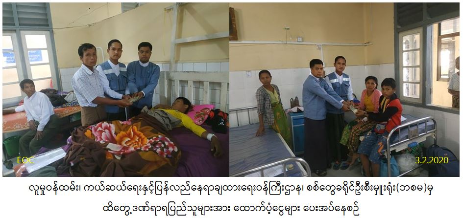 လူမှုဝန်ထမ်း၊ ကယ်ဆယ်ရေးနှင့်ပြန်လည်နေရာချထားရေးဝန်ကြီးဌာန၊ ဘေးအန္တရာယ်ဆိုင်ရာစီမံခန့်ခွဲမှုဦးစီးဌာန၊ စစ်တွေခရိုင်ဦးစီးမှူးရုံး(ဘစမ)မှ (၂.၂.၂၀၂၀)ရက်တွင် ရသေ့တောင်မြို့နယ်၊ ပြိန်းတောကျေးရွာမှ လက်နက်ကြီးကျည်ထိမှန်မှုကြောင့် စစ်တွေမြို့၊ ပြည်သူ့ဆေးရုံကြီးသို့ ဆေးကုသမှုခံယူရန် ရောက်ရှိလာသည့် ဒဏ်ရာရရှိသူ(၃)ဦးအတွက် ဒဏ်ရာရထောက်ပံ့ငွေ(၁၅၀၀၀ဝိ/-)အား (၃.၂.၂၀၂၀)ရက်တွင် ထောက်ပံ့ပေးအပ်ခဲ့ကြောင်းသတင်းရရှိပါသည်။