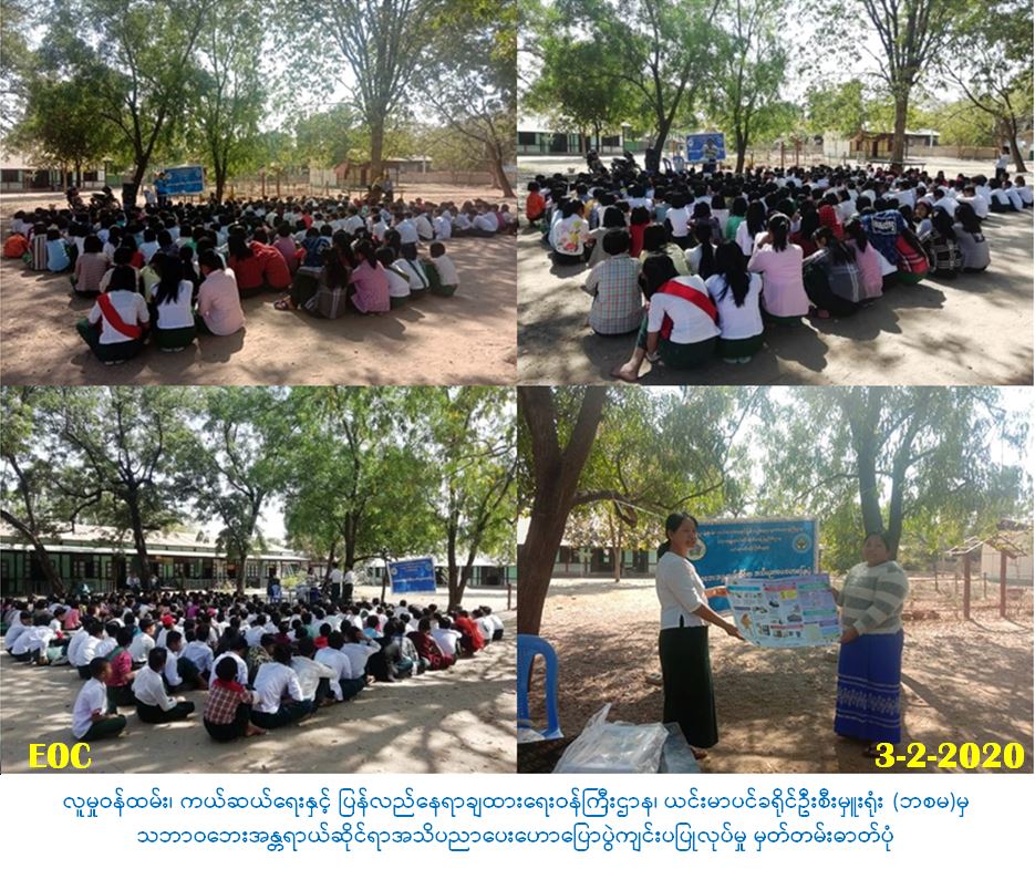 လူမှုဝန်ထမ်း၊ ကယ်ဆယ်ရေးနှင့်ပြန်လည်နေရာချထားရေးဝန်ကြီးဌာန၊ ဘေးအန္တရာယ်ဆိုင်ရာ စီမံခန့်ခွဲမှုဦးစီးဌာန၊ယင်းမာပင်ခရိုင်ဦးစီးမှူးရုံးမှ တာဝန်ရှိသူများသည် (၃-၂-၂၀၂၀) ရက်နေ့တွင် ပုလဲမြို့ ၊ညောင်ကုန်းကျေးရွာ အထက်တန်းကျောင်းခွဲ၌ သဘာဝဘေးလျော့ပါးရေး အသိပညာပေး ဟောပြောပွဲကျင်းပပြုလုပ်ခဲ့ရာ အဆိုပါဟောပြောပွဲသို့ ဆရာ/ဆရာမ (၁၀)ဦးနှင့် ကျောင်းသား/ ကျောင်းသူ(၃၂၈)ဦးတက်ရောက်ခဲ့ပြီး တက်ရောက်လာသူများအား လက်ကမ်းစာစောင်များဝေငှ ပေးခြင်းနှင့် နံရံကပ်ပိုစတာများ ပေးအပ်ခဲ့ပါကြောင်း သတင်းရရှိပါသည်။