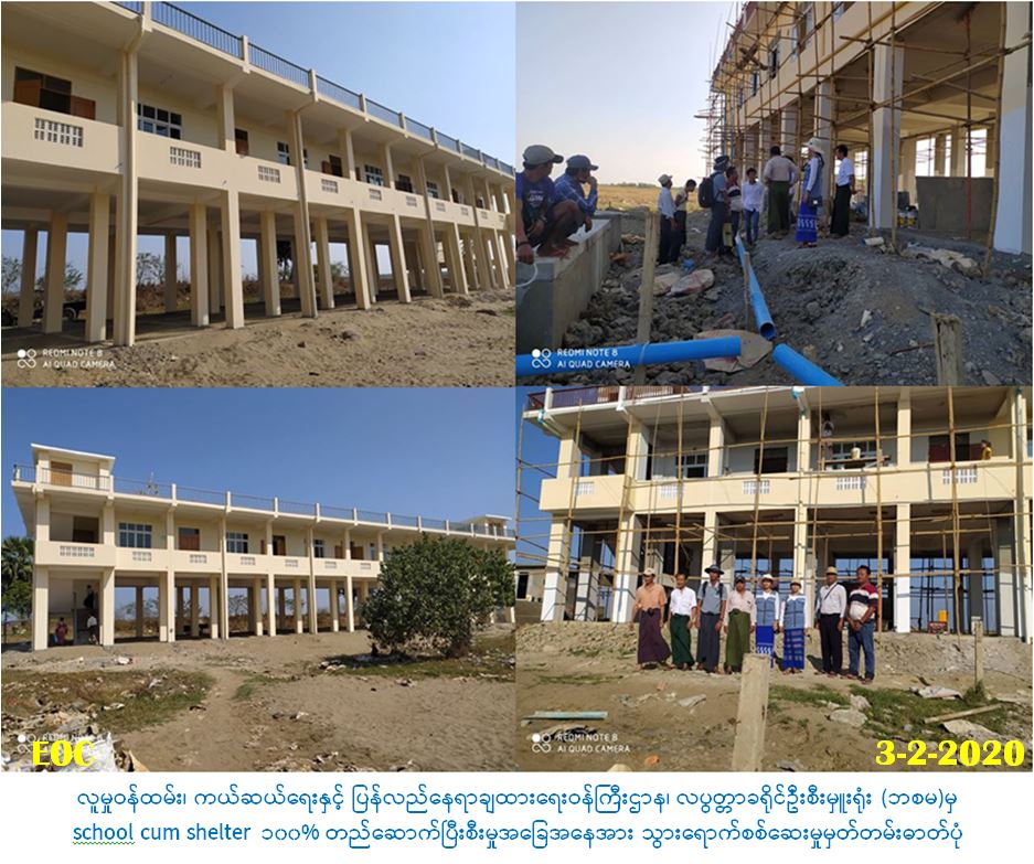 လူမှုဝန်ထမ်း၊ ကယ်ဆယ်ရေးနှင့်ပြန်လည်နေရာချထားရေးဝန်ကြီးဌာန၊ ဘေးအန္တရာယ်ဆိုင်ရာ စီမံခန့်ခွဲမှုဦးစီးဌာန၊ လပွတ္တာခရိုင်ဦးစီးမှူးရုံးမှ တာဝန်ရှိသူများသည်(၃-၂-၂၀၂၀)ရက်နေ့၌ မြို့နယ်ဆောက်လုပ်ရေးကြီးကြပ်မှုကော်မတီအဖွဲ့နှင့်အတူ အမျိုးသားသဘာဝဘေးအန္တရာယ်ဆိုင်ရာ စီမံခန့်ခွဲမှုကော်မတီ၏ ရန်ပုံငွေဖြင့် ဦးဘန်သိန်းကုမ္ပဏီမှတာဝန်ယူ တည်ဆောက်လျက်ရှိသော လပွတ္တာမြို့နယ်၊ ဆင်ခြေရာကျေးရွာအုပ်စု၊ အုံတုံကုန်းကျေးရွာမှ school cum shelter တည်ဆောက်မှု ၁၀၀% တည်ဆောက်ပြီးစီးမှုအခြေအနေနှင့် သပြုကုန်းကျေးရွာအုပ်စု၊ ရေဝေ ကျေးရွာမှ ၇၅% တည်ဆောက်ပြီးစီးမှုအခြေအနေအား သွားရောက်စစ်ဆေးခဲ့ပါကြောင်း သတင်း ရရှိပါသည်။