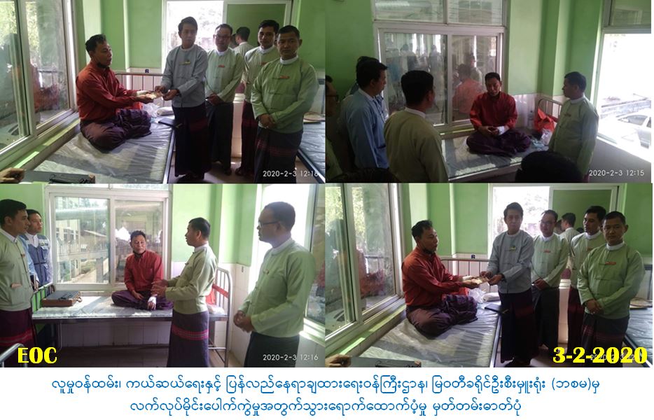 လူမှုဝန်ထမ်း၊ ကယ်ဆယ်ရေးနှင့်ပြန်လည်နေရာချထားရေးဝန်ကြီးဌာန၊ ဘေးအန္တရာယ်ဆိုင်ရာ စီမံခန့်ခွဲမှုဦးစီးဌာန၊ မြတတီခရိုင်ဦးစီးမှူးရုံးမှ တာဝန်ရှိသူများသည် (၃-၂-၂၀၂၀)ရက်နေ့၊ မနက် (၇:၀၀)နာရီအချိန်တွင် လက်လုပ်မိုင်း(၂)လုံးပေါက်ကွဲခဲ့မှုကြောင့် ဒဏ်ရာရရှိသူ(၂)ဦးအနက်မှ မြဝတီမြို့ဆေးရုံတက်ကုသမှုခံယူလျက်ရှိသော ဒဏ်ရာရရှိသူ(၁)ဦးအတွက် ထောက်ပံ့ဖိုးငွေ (၅၀၀၀၀/-)ကျပ်အား (၁၂:၁၆) နာရီအချိန်တွင် မြဝတီခရိုင်အုပ်ချုပ်ရေးမှူး၊ ဒုခရိုင်အုပ်ချုပ်ရေးမှူး၊ ခရိုင်ဆေးရုံအုပ်ဆရာဝန်ကြီး၊ ဒုမြို့နယ်အုပ်ချုပ်ရေးမှူးတို့နှင့်အတူ သွားရောက်ထောက်ပံ့ပေးအပ် ခဲ့ပါကြောင်း သတင်းရရှိပါသည်။