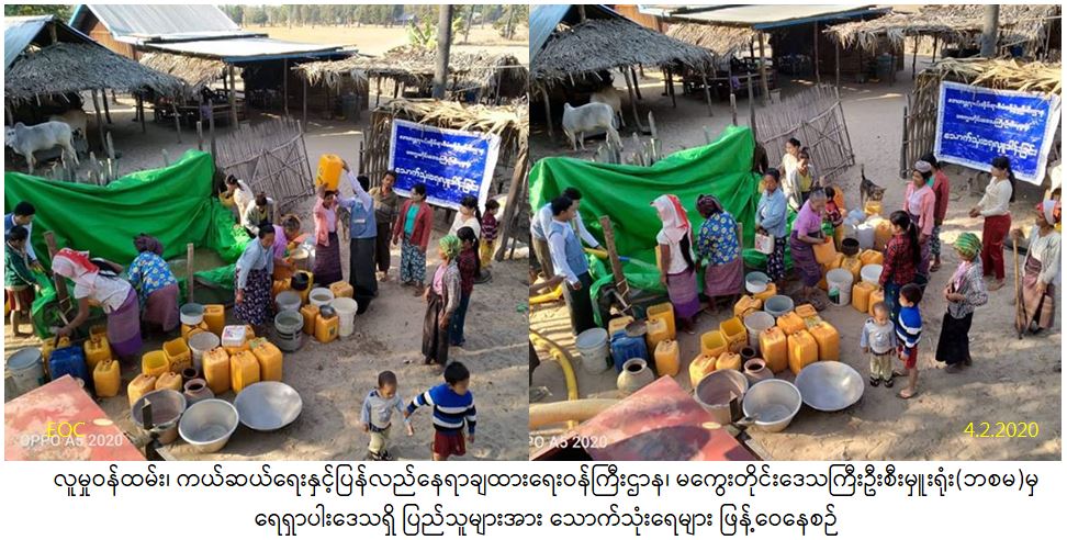 လူမှုဝန်ထမ်း၊ ကယ်ဆယ်ရေးနှင့်ပြန်လည်နေရာချထားရေး၀န်ကြီးဌာန၊ ဘေးအန္တရာယ်ဆိုင်ရာစီမံခန့်ခွဲမှုဦးစီးဌာန၊ မကွေးတိုင်းဒေသကြီးဦးစီးမှူးရုံးမှ တာဝန်ရှိသူများသည် သောက်သုံးရေရှားပါးမှုအခက်အခဲနှင့် ကြုံတွေ့နေရသော မကွေးမြို့နယ် ၊ကြာကန်ကျေးရွာအုပ်စု၊ အောင်ချမ်းသာကွက်သစ်နှင့် ကြူချောင်းရွာသစ်ကျေးရွာရှိ ကျေးရွာနေပြည်သူ အိမ်ခြေ (၁၂၃) လုံး၊ အိမ်ထောင် စု (၁၃၁) စု၊ လူဦးရေ (၆၁၅) ဦးတို့အတွက် သောက်သုံးရေဂါလံ (၆၀၀၀) အား ( ၄- ၂-၂၀၂၀) ရက်နေ့ ( ၁၁ : ၃၀ ) နာရီအချိန်တွင် ကျေးရွာအရောက် သွားရောက်ဖြန့်ဝေပေးခဲ့ပါကြောင်း သတင်းရရှိပါသည်။
