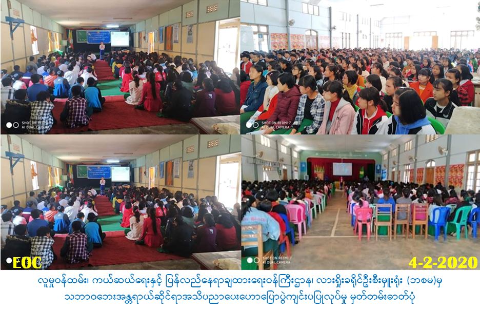 လူမှုဝန်ထမ်း၊ ကယ်ဆယ်ရေးနှင့် ပြန်လည်နေရာချထားရေးဝန်ကြီးဌာန၊ ဘေးအန္တရာယ်ဆိုင်ရာ စီမံခန့်ခွဲမှုဦးစီးဌာန၊ လားရှိူးခရိုင်ဦးစီးမှူးရုံးမှ တာဝန်ရှိသူများသည် (၄-၂-၂၀၂၀) ရက်နေ့၊ နံနက် (၀၉:၃၀)အချိန်တွင် အ.ထ.က (၄)ကျောင်း၊ လားရှိုးမြို့တွင် ကျောင်းသား/သူ (၆၀၀)ဦးနှင့် နေ့လည် (၁၃:၀၀)အချိန်တွင် အ.ထ.က (၈) ကျောင်း၊ လားရှိုးမြို့တွင် ကျောင်းသား/သူ (၅၀၀)ဦးတို့အား ငလျင်ဘေးနှင့် အခြားသဘာဝဘေးများအကြောင်း အသိပညာပေးဟောပြောပွဲကို ကျင်းပပြုလုပ်ခဲ့ ပြီး ဘေး(၈)မျိူး လက်ကမ်းစာစောင်များဖြန့်ဝေပေးခြင်း၊ သဘာဝဘေးသရုပ်ပြဗီဒီယိုများပြသခြင်း တို့ ဆောင်ရွက်ခဲ့ပါကြောင်း သတင်းရရှိပါသည်။