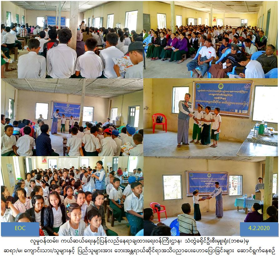 လူမှုဝန်ထမ်း၊ ကယ်ဆယ်ရေးနှင့်ပြန်လည်နေရာချထားရေးဝန်ကြီးဌာန၊ ဘေးအန္တရာယ်ဆိုင်ရာစီမံခန့်ခွဲမှုဦးစီးဌာန၊ သံတွဲခရိုင်ဦးစီးမှူးရုံးမှ ရခိုင်ပြည်နယ်၊ သံတွဲခရိုင်၊ သံတွဲမြို့နယ်၊ မဲနယ်ကွင်းကျေးရွာအုပ်စု၊ အထက်တန်းကျောင်းခန်းမ၌ (၄.၂.၂၀၂၀)ရက်နေ့၊ (၁၃:၃၀)နာရီချိန်မှ (၁၅:၃၀)နာရီချိန်အထိ “သဘာဝဘေးအန္တရာယ်ဆိုင်ရာအသိပညာပေးဟောပြောပွဲ” ကျင်းပခဲ့ပါသည်။ ယင်းဟောပြောပွဲတွင် သဘာဝဘေးအန္တရာယ်ဆိုင်ရာသိမှတ်ဖွယ်ရာများကို ဟောပြောဆွေးနွေးသရုပ်ပြခြင်းများ ဆောင်ရွက်ခဲ့ရာ ဆရာ/ဆရာမ၊ ကျောင်းသား/ သူများနှင့် ကျေးရွာသူ/သား စုစုပေါင်း (၁၆၀)ဦးတက်ရောက်ခဲ့ကြောင်း သတင်းရရှိပါသည်။