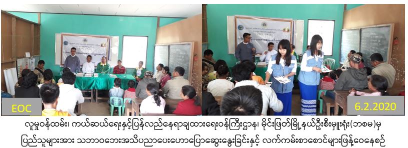 လူမှုဝန်ထမ်း၊ ကယ်ဆယ်ရေးနှင့်ပြန်လည်နေရာချထားဝန်ကြီးဌာန၊ ဘေးအန္တရာယ်ဆိုင်ရာစီမံခန့်ခွဲမှုဦးဌာန၊ မိုင်းဖြတ်မြို့နယ်ဦးစီးမှူးရုံးမှ တာဝန်ရှိသူများသည် (6-2-2020)ရက်နေ့ နံနက်(၁၀:၀၀)မှ(၁၁:၃၀)နာရီထိ မိုင်းဖြတ်မြို့နယ်၊ ဆိုင်ဆက်ကျေးရွာတွင် မြို့နယ်ပြန်/ဆက်ဦးစီးဌာနနှင့် မြို့နယ်စိုက်ပျိုးရေးဦးစီးဌာနတို့နှင့် ပူးပေါင်း၍ အသိပညာပေးဟောပြောပွဲပြုလုပ်ခဲ့ပါသည်။ အဆိုပါအသိပညာပေးဟောပြောပွဲတွင် ဦးစီးဌာန၏လုပ်ငန်းတာဝန်များ၊ ငလျင်ဘေးနှင့်အခြားသဘာဝဘေးဆိုင်ရာ ဆောင်ရန်ရှောင်ရန်များ၊ ထောက်ပံ့နှုန်းထားများ စသည့်အသိပညာများအား တတ်ရောက်လာသူ ကျေးရွာသူ၊ကျေးရွာသား (၅၀)ဦးတို့အား ဟောပြောဆွေးနွေးခဲ့ပြီး အသိပညာပေးလက်ကမ်းစာစောင်များ ဖြန့်ဝေပေးခဲ့ကြောင်း သတင်းရရှိပါသည်။