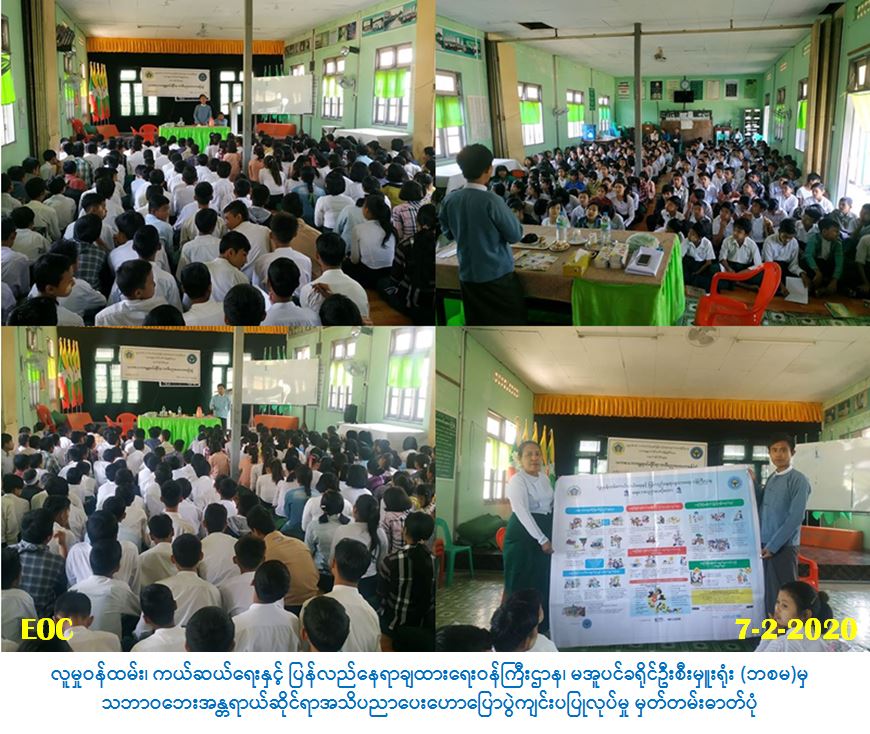 လူမှုဝန်ထမ်း၊ ကယ်ဆယ်ရေးနှင့်ပြန်လည်နေရာချထားရေးဝန်ကြီးဌာန ၊ဘေးအန္တရာယ်ဆိုင်ရာစီမံ ခန့်ခွဲမှုဦးစီးဌာန၊ မအူပင်ခရိုင်ဦးစီးမှူးရုံးမှတာဝန်ရှိသူများသည် (၇-၂-၂၀၂၀)ရက်နေ့၊(၁၀:၀၀)အချိန် တွင် မအူပင်မြို့၊ အမှတ်(၄) အခြေခံပညာအထက်တန်းကျောင်း၌ ဆရာ/ဆရာမ (၁၀)ဦးနှင့် ကျောင်း သား/ကျောင်းသူ (၃၀၀)ဦးတို့အား သဘာဝဘေးအန္တရာယ်ဆိုင်ရာ အသိပညာပေးဟောပြော ဆွေးနွေးခဲ့ပြီး အသိပညာပေးလက်ကမ်းစာစောင်နှင့် အသိပညာပေးဗွီနိုင်းပိုစတာများ ပေးအပ်ခဲ့ပါ ကြောင်း သတင်းရရှိပါသည်။