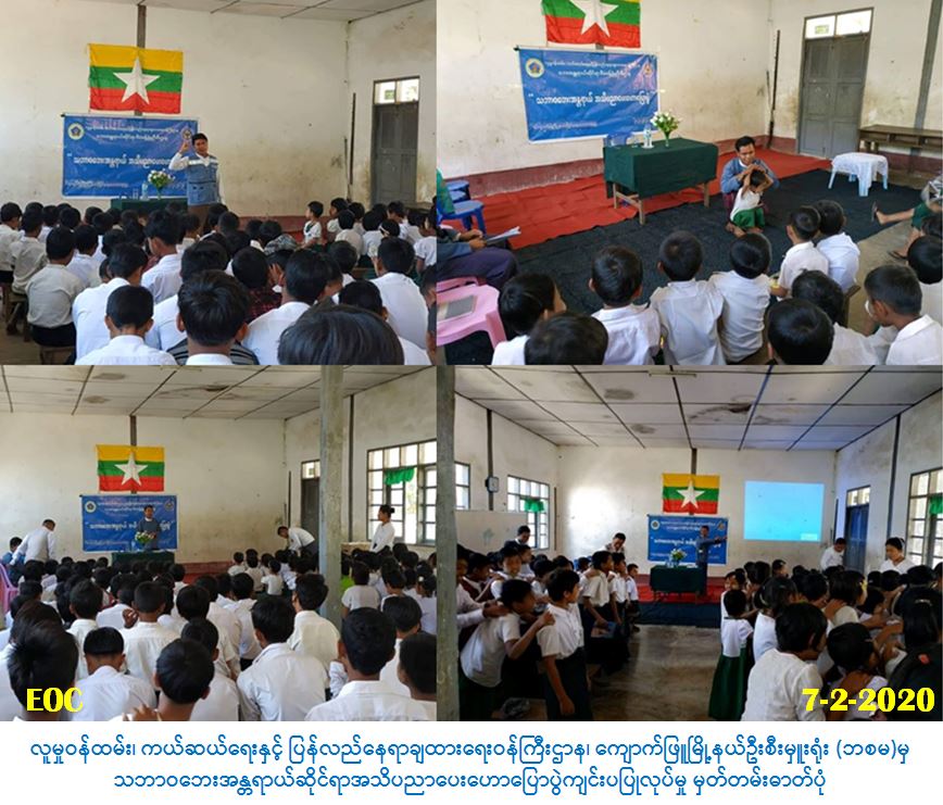 လူမှုဝန်ထမ်း၊ ကယ်ဆယ်ရေးနှင့် ပြန်လည်နေရာချထားရေးဝန်ကြီးဌာန၊ ဘေးအန္တရာယ်ဆိုင်ရာစီမံ ခန့်ခွဲမှုဦးစီးဌာန၊ ကျောက်ဖြူမြို့နယ်ဦးစီးမှူးရုံးမှ တာဝန်ရှိသူများသည် (၇-၂-၂၀၂၀ )ရက်နေ့၊ နံနက် (၁၁:၀၀)နာရီမှ(၁၂:၀၀)နာရီအထိ ကျောက်ဖြူမြို့နယ်၊ ပြိုင်းစေ့ကေကျေးရွာ၊အလယ်တန်းကျောင်း၌ သဘာဝဘေးအန္တရာယ်များဖြစ်သည့် မီးဘေး၊ ရေဘေး၊ ငလျင်ဘေး၊ မိုးကြိုးဘေးနှင့် မုန်တိုင်းဘေး အန္တရာယ်များနှင့်ပတ်သက်၍ ဆောင်ရန်/ ရှောင်ရန်များအား ဆွေးနွေးဟောပြောခဲ့ပြီး တက်ရောက်လာသည့်ဆရာ/ဆရာများနှင့် ကျောင်းသား/သူ (၁၃၀)ဦးခန့်အား လက်ကမ်းစာစောင်များဝေငှပေးခဲ့ ပါကြောင်း သတင်းရရှိပါသည်။