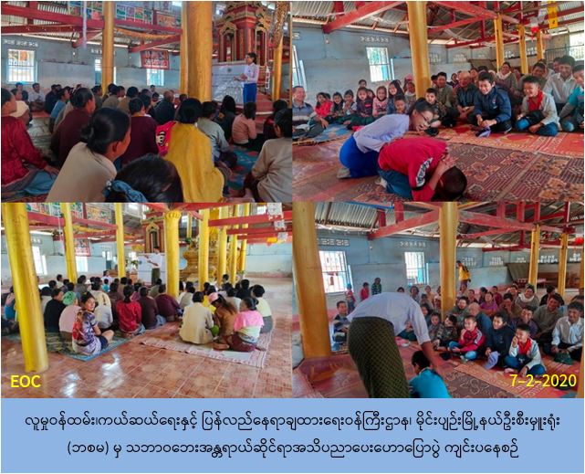 လူမှုဝန်ထမ်း၊ ကယ်ဆယ်ရေးနှင့်ပြန်လည်နေရာချထားရေး၀န်ကြီးဌာန၊ ဘေးအန္တရာယ်ဆိုင်ရာ စီမံခန့်ခွဲမှုဦးစီးဌာန၊ မိုင်းပျဉ်းမြို့နယ်ဦးစီးမှူးရုံးမှ တာဝန်ရှိသူများသည် (၇-၂-၂၀၂၀) ရက်နေ့ (၁၃:၀၀) နာရီအချိန်မှ (၁၄:၃၀) နာရီ အချိန်ထိ မိုင်းပျဉ်းမြို့နယ်၊ ဝမ်ဖြစ်ကျေးရွာအုပ်စု၊ ဝမ်ဖြစ်ကျေးရွာ ဘုန်းကြီးကျောင်းတွင် သဘာဝဘေးအသိပညာပေးဟောပြောပွဲပြုလုပ်ခဲ့ရာ ကျေးရွာနေ ပြည်သူလူထု စုစုပေါင်း (၁၀၀) ဦးခန့်တက်ရောက်ခဲ့ပြီး အဆိုပါ ဟောပြောပွဲတွင် ဦးစီးဌာန၏ လုပ်ငန်းတာဝန်များ၊ ရည်ရွယ်ချက်များ၊ ထောက်ပံ့မှုနှုန်းထားများ၊ ဘေး (၈) မျိုး အကြောင်း ဆောင်ရန်/ ရှောင်ရန်များ၊ ငလျင်လှုပ်ခတ်စဉ်အတွင်း နေထိုင်ရမည့်အနေအထား များအား လက်တွေ့သရုပ်ပြခြင်း၊ လက်ကမ်းစာစောင် ဖြန့်ဝေပေးခြင်းများကို ဆောင်ရွက်ခဲ့ ပါကြောင်း သိရှိရပါသည်။