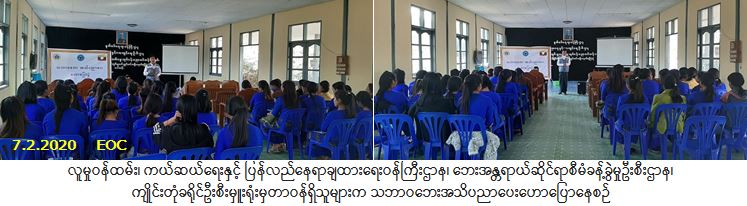 လူမှုဝန်ထမ်း၊ ကယ်ဆယ်ရေးနှင့် ပြန်လည်နေရာချထားရေးဝန်ကြီးဌာန၊ ဘေးအန္တရာယ်ဆိုင်ရာစီမံခန့်ခွဲမှုဦးစီး ဌာန၊ ကျိုင်းတုံခရိုင်ဦးစီးမှူးရုံးမှတာဝန်ရှိသူများသည် (၇-၂-၂၀၂၀) ရက်နေ့၊ (၁၃:၀၀) နာရီအချိန်မှ (၁၅:၀၀) နာရီအချိန်အထိ ကျိုင်းတုံမြို့ ၊ အမျိုးသမီးအိမ်တွင်းမှုသက်မွေးလုပ်ငန်းပညာပေးသင်တန်းကျောင်း၌ သင်တန်းသူ (၇၀) ဦးခန့်ကို သဘာဝဘေးအန္တရာယ်များနှင့်စပ်လျဉ်း၍ ဆောင်ရန်/ရှောင်ရန်အချက်များအား အသိပညာပေး ဟောပြောခဲ့ပြီး တက်ရောက်လာသူများအား သဘာဝဘေးအသိပညာပေး လက်ကမ်းစာစောင်များ ဖြန့်ဝေ ပေးခဲ့ပါကြောင်း သတင်းရရှိပါသည်။
