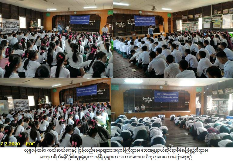လူမှုဝန်ထမ်း၊ ကယ်ဆယ်ရေးနှင့် ပြန်လည်နေရာချထားရေးဝန်ကြီးဌာန၊ ဘေးအန္တရာယ်ဆိုင်ရာစီမံခန့်ခွဲမှုဦးစီး ဌာန၊ ကော့ကရိတ်ခရိုင်ဦးစီးမှူးရုံးမှတာဝန်ရှိသူများသည် ပြန်ကြားရေးနှင့် ပြည်သူ့ဆက်ဆံရေးဦးစီးဌာန၊ စားသုံးသူရေးရာဦးစီးဌာနတို့နှင့်ပူးပေါင်း၍ (၇-၂-၂၀၂၀) ရက်နေ့၊ (၁၀:၀၀)နာရီအချိန်မှ (၁၂:၀၀) နာရီအချိန်အထိ ကော့ကရိတ်မြို့နယ်၊ အ.ထ.က(ချောင်းတောင်)၌ ကျောင်းသား/ကျောင်းသူ (၁၈၀)ဦးတို့ကို ဦးစီးဌာန၏ လုပ်ငန်းတာဝန်များ၊ ထောက်ပံ့မှုနှုန်းထားများ၊ သဘာဝဘေးအန္တရာယ်များနှင့်စပ်လျဉ်း၍ ဆောင်ရန်/ရှောင်ရန် အချက်များအသိပညာပေးဟောပြောခြင်းနှင့် သရုပ်ပြဆောင်ရွက်စေခြင်းတို့ပြုလုပ်ခဲ့ပြီး ဘေး(၈)မျိုးပါ လက်ကမ်းစာစောင်များ ဖြန့်ဝေပေးခဲ့ပါကြောင်း သတင်းရရှိပါသည်။