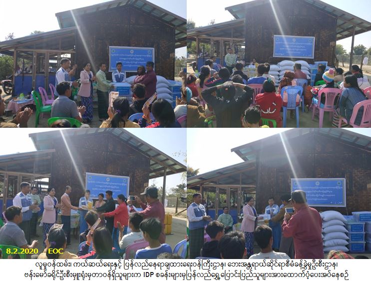 လူမှုဝန်ထမ်း၊ ကယ်ဆယ်ရေးနှင့် ပြန်လည်နေရာချထားရေးဝန်ကြီးဌာန၊ ဘေးအန္တရာယ်ဆိုင်ရာစီမံခန့်ခွဲမှုဦးစီး ဌာန၊ ဗန်းမော်ခရိုင်ဦးစီးမှူးရုံးမှတာဝန်ရှိသူများသည် မံပုံ(RC)၊ IDP စခန်းများမှ ဗန်းမော်ခရိုင်၊ မိုးမောက်မြို့နယ်၊ ကြေးနန်းရပ်ကွက်သို့ ပြောင်းရွှေ့အိမ်ထောင်စု(၂၇)စု၊ လူဦးရေ (၁၅၇)ဦးတို့အတွက် (၁)အိမ်ထောင်စုလျှင် ဆီ (၁)လစာ (၂)ပိဿာနှုန်းဖြင့်(၅၄)ပိဿာ၊ ပဲ(၁)လစာ (၂) ပိဿာနှုန်းဖြင့် (၅၄)ပိဿာ၊ ဆား (၁)ပိဿာနှုန်းဖြင့် (၁)လစာ(၂၇)ပိဿာ၊ လူဦးရေ (၁၅၇)ဦးအတွက် ဆန် (၁)ဦးလျှင် နို့ဆီဗူး(၆၀)ဗူးနှုန်းဖြင့် (၁) လစာ (၄၉)အိတ်(၁)ပြည်(၄)ဗူး တို့ကို (၈-၂-၂၀၂၀)ရက်နေ့၊ (၁၀:၀၀)နာရီအချိန်တွင် သွားရောက်ထောက်ပံ့ပေးအပ်ခဲ့ ပါကြောင်း သတင်းရရှိပါသည်။