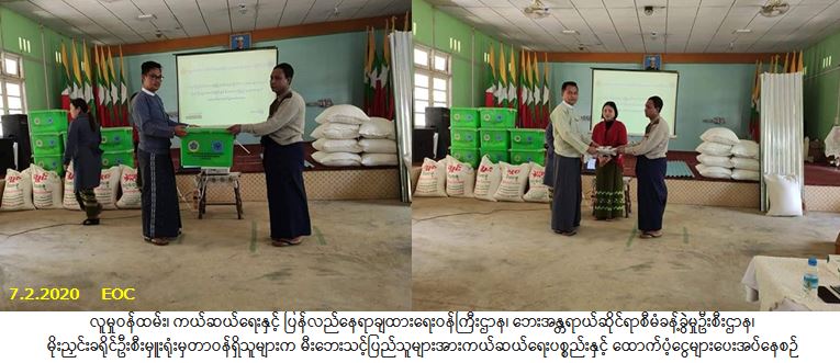လူမှုဝန်ထမ်း၊ ကယ်ဆယ်ရေးနှင့် ပြန်လည်နေရာချထားရေးဝန်ကြီးဌာန၊ ဘေးအန္တရာယ်ဆိုင်ရာစီမံခန့်ခွဲမှုဦးစီး ဌာန၊ မိုးညှင်းခရိုင်ဦးစီးမှူးရုံးမှတာဝန်ရှိသူများသည် ဖားကန့်မြို့နယ်၊ မော်ဝမ်းရပ်ကွက်၌ (၃၁-၁-၂၀၂၀) ရက်နေ့တွင် ဖြစ်ပွားခဲ့သော မီးဘေးကြောင့် တစ်စိတ်တစ်ပိုင်းပျက်စီးနေအိမ်(၁)လုံး၊ အိမ်ထောင်စု (၁)စုမှ လူဦးရေ(၁၀)ဦးတို့အတွက် အိမ်ဆောက်ပစ္စည်းဖိုးထောက်ပံ့ငွေ ကျပ်(၁၀၀,၀၀ဝ/-)၊ လူဦးရေ(၁၀)ဦးအတွက် ဆန်ရိက္ခာ(၇)ရက်စာဖိုးထောက်ပံ့ငွေ (၂၁,၀၀ဝ/-) ကျပ်နှင့် ကယ်ဆယ်ရေးပစ္စည်း(၁၀)မျိုး (၁)အိမ်ထောင်စုစာ တို့ကိုလည်းကောင်း၊ ဖားကန့်မြို့နယ်၊ ဆိပ်မူကျေးရွာအုပ်စု၊ မော်ရှန်ကျေးရွာ၌ (၂-၂-၂၀၂၀)ရက်နေ့တွင် ဖြစ်ပွားခဲ့သောမီးဘေးကြောင့် လုံးဝပျက်စီးနေအိမ်(၅)လုံး၊ အိမ်ထောင်စု (၇)စုမှ လူဦးရေ(၃၀)ဦးတို့အတွက် အိမ်ဆောက်ပစ္စည်းဖိုးထောက်ပံ့ငွေ ကျပ် (၁,၀၀၀,၀၀ဝ/-)၊ လူဦးရေ(၃၀)ဦးအတွက် ဆန်ရိက္ခာ(၇)ရက်စာဖိုး ထောက်ပံ့ငွေ (၆၃,၀၀ဝ/-) ကျပ်နှင့် ကယ်ဆယ်ရေးပစ္စည်း(၁၇)မျိုး (၇)အိမ်ထောင်စုစာတို့ကိုလည်းကောင်း (၇-၂-၂၀၂၀)ရက်နေ့၊ (၁၁:၃၀)အချိန်တွင် ဖားကန့်မြို့နယ်၊ အထွေထွေအုပ်ချုပ်ရေးဦးစီးဌာနအစည်းအဝေးခန်းမ၌ မြို့နယ်သဘာဝဘေးစီမံခန့်ခွဲမှုအဖွဲ့နှင့်အတူ ထောက်ပံ့ပေးအပ်ခဲ့ပါကြောင်း သတင်းရရှိပါသည်။