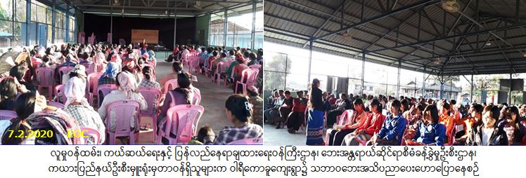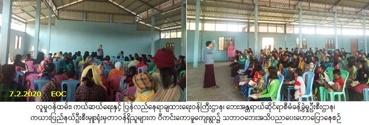 လူမှုဝန်ထမ်း၊ ကယ်ဆယ်ရေးနှင့် ပြန်လည်နေရာချထားရေးဝန်ကြီးဌာန၊ ဘေးအန္တရာယ်ဆိုင်ရာစီမံခန့်ခွဲမှုဦးစီး ဌာန၊ ကယားပြည်နယ်ဦးစီးမှူးရုံးမှတာဝန်ရှိသူများသည် (၇-၂-၂၀၂၀)ရက်နေ့၊ (၁၆:၄၅)နာရီမှ (၁၈:၀၀)နာရီအချိန်အထိ လွိုင်ကော်မြို့နယ်၊ ကုန်းသာကျေးရွာအုပ်စု၊ ဝါရီကောခူကျေးရွာ၌ ကျေးရွာပြည်သူ(၁၆၀)ဦးကိုလည်းကောင်း၊ ပီကင်းကောခူကျေးရွာ၌ ကျေးရွာပြည်သူ(၁၅၀)ဦးကိုလည်းကောင်း သဘာဝဘေးအန္တရာယ်ဆိုင်ရာ အသိပညာပေးဟောပြောပွဲကို တစ်ပြိုင်နက်ကျင်းပခဲ့ပြီး တက်ရောက်လာသူများ အား လက်ကမ်းစာစောင်များဖြန့်ဝေပေးခဲ့ပါကြောင်း သတင်းရရှိပါသည်။