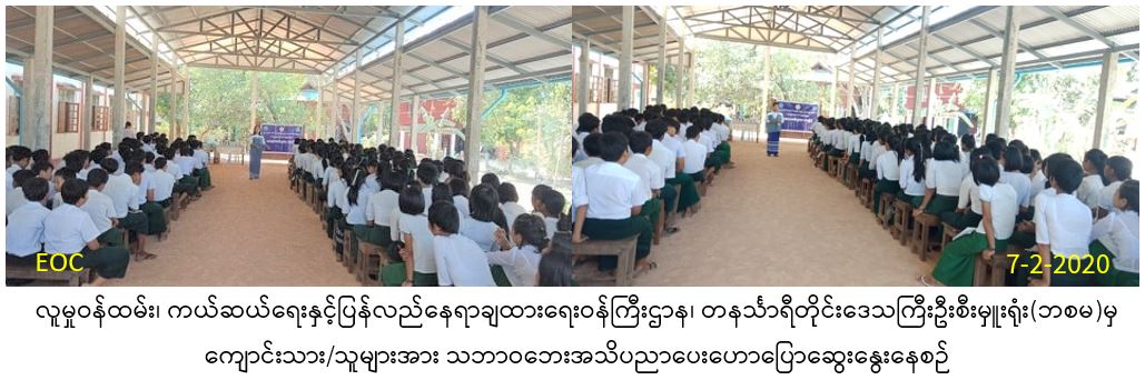 လူမှုဝန်ထမ်း၊ ကယ်ဆယ်ရေးနှင့်ပြန်လည်နေရာချထားရေးဝန်ကြီးဌာန၊ ဘေးအန္တရာယ်ဆိုင်ရာစီမံခန့်ခွဲမှုဦးစီးဌာန၊ တနင်္သာရီတိုင်းဒေသကြီးဦးစီးမှူးရုံးမှ တာဝန်ရှိသူများသည် (၇-၂-၂၀၂၀) ရက်နေ့၊ (၁၄:၀၀) နာရီအချိန်တွင် ရေဖြူမြို့နယ်၊ ညင်စထွေးကျေးရွာ၊ အ.ထ.က ကျောင်း၌ ကျောင်းသား/ကျောင်းသူ၊ ဆရာ/ဆရာမနှင့် ကျေးရွာသူ/သား စုစုပေါင်း (၂၀၀)ဦး တို့ကို သဘာဝဘေးအသိပညာပေးဟောပြောခြင်း၊ အသိပညာပေး ဗီဒီယိုပြသခြင်း၊ လက်ကမ်းစာစောင်များနှင့် ဘောပင်များဖြန့်ဝေခြင်းတို့ ဆောင်ရွက်ခဲ့ပါကြောင်း သတင်းရရှိပါသည်။
