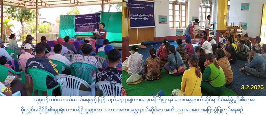 လူမှုဝန်ထမ်း၊ ကယ်ဆယ်ရေးနှင့် ပြန်လည်နေရာချထားရေးဝန်ကြီးဌာန၊ ဘေးအန္တရာယ်ဆိုင်ရာစီမံခန့်ခွဲမှုဦးစီးဌာန၊ မိုးညှင်းခရိုင်ဦးစီးမှူးရုံးမှတာဝန်ရှိသူများသည် (၈-၂-၂၀၂၀) ရက်နေ့ (၁၀:၃၀) အချိန်မှ (၁၂:၀၀) အချိန်ထိ မိုးကောင်းမြို့နယ်၊ အောင်ချမ်းစုကျေးရွာဓမ္မာရုံ၌ ပြည်သူလူထု (၁၀၀) ဦးခန့်အားလည်းကောင်း၊ (၁၄:၀၀) အချိန်မှ (၁၅:၃၀) အချိန်ထိ မိုးကောင်းမြို့နယ်၊ စံပါရီကျေးရွာ ထာကူဗာရီးဘုရားကျောင်း၌ ပြည်သူလူထု (၁၀၀) ဦး ခန့်အားလည်းကောင်း သဘာဝဘေးအန္တရာယ်ဆိုင်ရာ အသိပညာပေးဟောပြောပွဲ ကျင်းပပြုလုပ်ခဲ့ပြီးတက်ရောက် လာသူများအား ဘေး (၈) မျိုး လက်ကမ်းစာစောင်များ ဖြန့်ဝေပေးခဲ့ပါကြောင်း သတင်းရရှိပါ သည်။