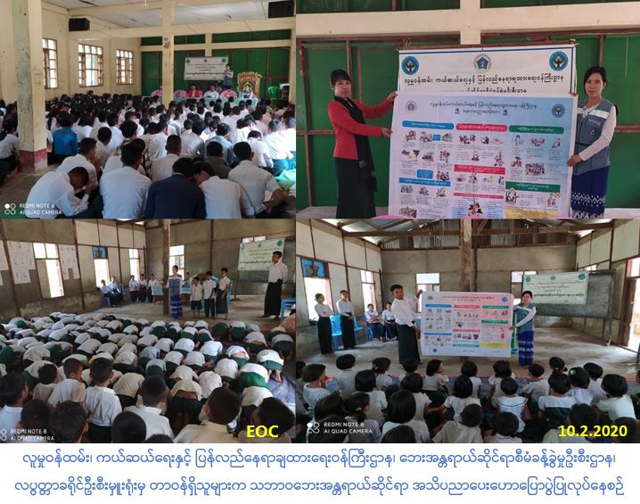 လူမှုဝန်ထမ်း၊ ကယ်ဆယ်ရေးနှင့် ပြန်လည်နေရာချထားရေးဝန်ကြီးဌာန၊ ဘေးအန္တရာယ်ဆိုင်ရာစီမံခန့်ခွဲမှုဦးစီးဌာန၊ လပွတ္တာခရိုင်ဦးစီးမှူးရုံးမှ တာဝန်ရှိသူများသည် (၁၀-၂-၂၀၂၀) ရက်နေ့ နံနက် (၁၀:၀၀) နာရီအချိန်တွင် ဧရာဝတီတိုင်းဒေသကြီး၊ လပွတ္တာခရိုင်၊ လပွတ္တာမြို့နယ် ဘိုင်းဒေါင့်ချာင်းကျေးရွာအုပ်စု၊ ဘိုကုန်းကျေးရွာရှိ အထက်တန်းကျောင်းမှ ကျောင်းသူ/ သား (၃၅၀)ဦး တို့အားလည်းကောင်း၊ နေ့လည် (၁၃:၀၀) နာရီအချိန်တွင် လပွတ္တာမြို့နယ်၊ ဘိုင်းဒေါင့်ချောင်းကျေးရွာအုပ်စု၊ ဘိုင်းဒေါင့်ကျေးရွာရှိ အလယ်တန်းကျောင်းမှ ဆရာ ဆရာမ၊ ကျောင်းသား/ သူ စုစုပေါင်း (၃၁၀) ဦးတို့အားလည်းကောင်း သဘာဝဘေးလျော့ပါးရေး အသိပညာပေးခြင်း၊ ဘေးရှစ်မျိုးလက်ကမ်းစာစောင်များ ဝေငှခြင်းနှင့် ကျောင်းအုပ်ဆရာမကြီး၊ ဆရာကြီးတို့အား မီးဘေးအန္တရာယ်နှင့် မုန်တိုင်းဘေးအန္တရာယ် အသိပညာပေးဗွီနိုင်းများ ပေးအပ်ခဲ့ပါကြောင်း သတင်းရရှိပါသည်။