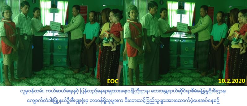 လူမှုဝန်ထမ်း၊ ကယ်ဆယ်ရေးနှင့် ပြန်လည်နေရာချထားရေးဝန်ကြီးဌာန၊ ဘေးအန္တရာယ်ဆိုင်ရာ စီမံခန့်ခွဲမှုဦးစီးဌာန၊ ကျောက်တံခါးမြို့နယ်ဦးစီးမှူး ရုံးမှတာ၀န်ရှိသူများသည် (၇-၂-၂၀၂၀) ရက်နေ့၌ ပဲခူးခရိုင်၊ ကျောက်တံခါးမြို့နယ်၊ ကွင်းမြောက်ရပ်ကွက်၊ ခေတ္တရာ (၆) လမ်းတွင် ဖြစ်ပွားခဲ့သော မီးဘေးမှပျက်စီးနေအိမ် (၁) လုံးအတွက်အိမ်ဆောက်ပစ္စည်းဖိုး ထောက်ပံ့ငွေ (၁၀၀၀၀၀/-) ကျပ်၊ လူဦးရေ (၁ဝ) ဦးအတွက် ဆန်ရိက္ခာဖိုးထောက်ပံ့ငွေ (၂၁၀၀၀/-) ကျပ်၊ စုစုပေါင်းထောက်ပံ့ငွေ (၁၂၁၀၀၀/-) ကျပ်၊ ကယ်ဆယ်ရေးပစ္စည်း (၁၉) မျိုး (ပလပ်စတစ်ပုံးအပါ) (၄) အိမ်ထောင်စာအား (၁၀-၂-၂၀၂၀) ရက်နေ့ (၁၃:၀၀) နာရီအချိန်တွင် ကျောက်တံခါးမြို့နယ် အထွေထွေအုပ်ချုပ်ရေးမှူးရုံး၌ မြို့နယ်အုပ်ချုပ်ရေးမှူးရုံးမှ တာ၀န်ရှိသူများ၊ သက်ဆိုင်ရာရပ် ကွက်အုပ်ချုပ်ရေးမှူးနှင့် အတူ ပြည်သူလက်၀ယ်အရောက်သွားရောက် ထောက်ပံ့ပေးအပ်ခဲ့ ပါကြောင်း သတင်းရရှိပါသည်။