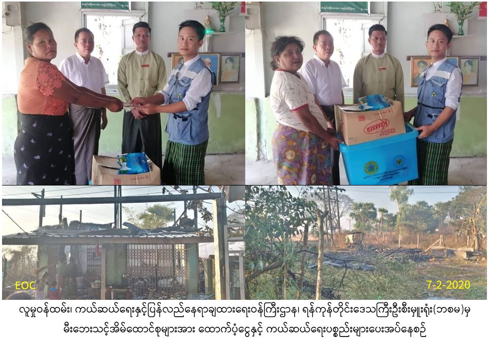 လူမှုဝန်ထမ်း၊ ကယ်ဆယ်ရေးနှင့်ပြန်လည်နေရာချထားရေးဝန်ကြီးဌာန၊ ဘေးအန္တရာယ်ဆိုင်ရာစီမံခန့်ခွဲမှုဦးစီးဌာန၊ ရန်ကုန်တိုင်းဒေသကြီးဦးစီးမှူးရုံးမှ ရန်ကုန်တိုင်းဒေသကြီး၊ တောင်ပိုင်းခရိုင်၊ တွံတေးမြို့နယ်၊ ကံဘဲ့ကျေးရွာအုပ်စု၊ ကဘင်းကျေးရွာတွင်(၆-၂-၂၀၂၀)ရက်နေ့(၁၆:၀၀)နာရီအချိန်၌ လယ်ရိုးပြတ်များမီးရှို့ရာမှ နေအိမ်မီးကူးစက် လောင်ကျွမ်းမှုဖြစ်ပွားခဲ့ရာ နေအိမ်(၂)လုံးမီးလောင်ပျက်စီးခဲ့ပြီး၊ အိမ်ထောင်စု(၂)စု မှလူဦးရေ(၁၂)ဦးတို့မီးဘေးသင့်ခဲ့ရာ၊ မီးဘေးသင့်နေအိမ်(၂)လုံးအတွက် အိမ်ဆောက်ပစ္စည်းဖိုးထောက်ပံ့ငွေကျပ်(၃၀၀,၀၀ဝိ/-)၊ လူဦးရေ(၁၂)ဦးအတွက် ဆန်ရိက္ခာဖိုးထောက်ပံ့ငွေကျပ်(၂၅၂၀ဝိ/-)နှင့် ကယ်ဆယ်ရေးပစ္စည်း(၁၆)မျိုး (၂)အိမ်ထောင်စုစာ တို့အား(၁၀-၂-၂၀၂၀)ရက်နေ့တွင် အထွေထွေအုပ်ချုပ်ရေးဦးစီးဌာနမှတာဝန်ရှိသူများနှင့်အတူ ဘေးသင့်ပြည်သူများထံသို့ သွားရောက်၍ ထောက်ပံ့ပေးခဲ့ကြောင်း သတင်းရရှိပါသည်။