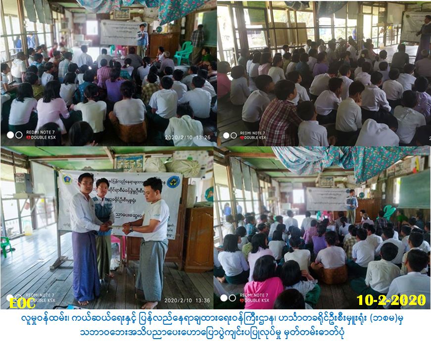 လူမှုဝန်ထမ်း၊ ကယ်ဆယ်ရေးနှင့် ပြန်လည်နေရာချထားရေးဝန်ကြီးဌာန၊ ဘေးအန္တရာယ်ဆိုင်ရာ စီမံခန့်ခွဲမှုဦးစီးဌာန၊ ဟင်္သာတခရိုင်ဦးစီးမှူးရုံးမှ တာဝန်ရှိသူများသည် (၁၀-၂-၂၀၂၀)ရက်နေ့၊ (၁၃:၀၀)နာရီအချိန်မှ (၁၅:၀၀)နာရီအချိန်အထိ ဟင်္သာတခရိုင်၊ ဟင်္သာတမြို့နယ်၊ ပဲကြီးကျွန်းကျေး ရွာအုပ်စု၊ လက်ပံစုကျေးရွာ အခြေခံပညာအလယ်တန်းကျောင်း၌ ကျောင်းသား/သူ (၁၀၀)ဦးနှင့် ကျေးရွာပြည်သူ (၅၀)ဦးခန့်အား သဘာဝဘေးအန္တရာယ်ဖြစ်ပေါ်စေသည့် ဆိုးကျိုးများနှင့်ရာသီဥတု ပြောင်းလဲခြင်းဆိုင်ရာအသိပညာဗဟုသုတများ သဘာဝဘေးအန္တရာယ်ဆိုင်ရာ ဆောင်ရန်/ရှောင် ရန်များအား ဆွေးနွေးဟောပြောပွဲပြုလုပ်ခြင်းနှင့် လက်ကမ်းစာစောင်များဝေငှပေးခြင်းတို့ ဆောင်ရွက်ခဲ့ပါကြောင်း သတင်းရရှိပါသည်။