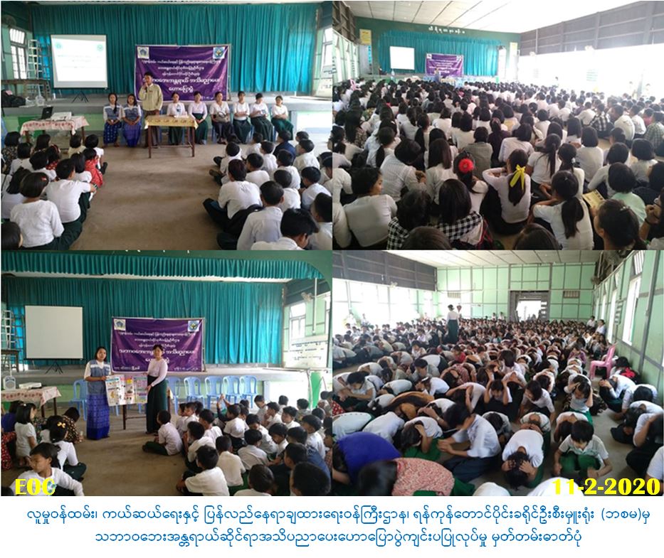 လူမှုဝန်ထမ်း၊ ကယ်ဆယ်ရေးနှင့် ပြန်လည်နေရာချထားရေးဝန်ကြီးဌာန၊ ဘေးအန္တရာယ်ဆိုင်ရာစီမံ ခန့်ခွဲမှုဦးစီးဌာန၊ ရန်ကုန်တောင်ပိုင်းခရိုင်ဦးစီးမှူးရုံးမှ တာဝန်ရှိသူများသည် (၁၁-၂-၂၀၂၀) ရက်နေ့၊ (၁၁:၀၀)နာရီအချိန်တွင် ကျောက်တန်းမြို့နယ်၊ တံတားမြို့၊ အခြေခံပညာအထက်တန်းကျောင်း၌ သဘာဝဘေးအန္တရာယ်မြေငလျင်နှင့် ပတ်သက်သော ဆောင်ရန်/ရှောင်ရန်များအား ဆောင်ရွက်နိုင် စေရန်အတွက် ဆရာ/ဆရာမနှင့် ကျောင်းသူ/ကျောင်းသား(၈၀၀)ဦးခန့်အား သဘာဝဘေးအန္တရာယ် နှင့်ပတ်သက်၍ အသိပညာပေးဟောပြောပွဲကျင်းပပြုလုပ်ခဲ့ပြီး လက်ကမ်းစာစောင်များအားဖြန့်ဝေ ပေးခဲ့ပါကြောင်း သတင်းရရှိပါသည်။