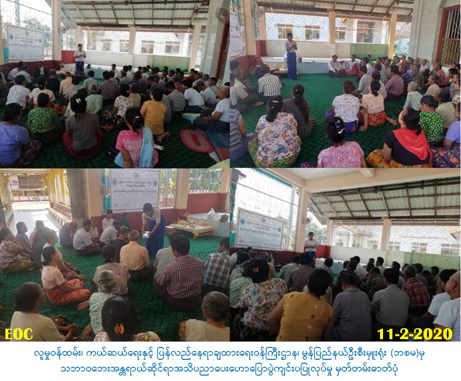 လူမှုဝန်ထမ်း၊ ကယ်ဆယ်ရေးနှင့်ပြန်လည်နေရာချထားရေးဝန်ကြီးဌာန၊ ဘေးအန္တရာယ်ဆိုင်ရာ စီမံခန့်ခွဲမှုဦးစီးဌာန မွန်ပြည်နယ်ဦးစီးမှူးရုံးမှတာဝန်ရှိသူများသည် (၁၁-၂-၂၀၂၀)ရက်နေ၊ (၁၀:၃၀) နာရီအချိန်မှ (၁၁:၃၀)နာရီအချိန်အထိ ကျိုက်မရောမြို့နယ်၊ ကျိုက်ပရန်ကျေးရွာ၌ ကျင်းပပြုလုပ်ခဲ့ ရာ ကျေးရွာသူ/သား စုစုပေါင်း(၁၀၀)ဦးခန့်တက်ရောက်ခဲ့ပြီး သဘာဝဘေးနှင့်စပ်လျဉ်း၍ ဆောင် ရန်/ရှောင်ရန်အချက်များ ဆွေးနွေးခြင်း၊ လက်ကမ်းစာစောင်ဖြန့်ဝေခြင်းများ ဆောင်ရွက်ခဲ့ပါ ကြောင်း သတင်းရရှိပါသည်။