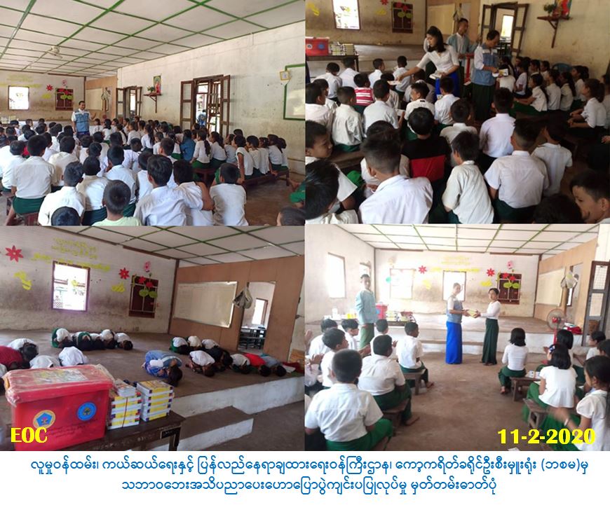 ခန့်ခွဲမှုဦးစီးဌာန၊ ကော့ကရိတ်ခရိုင်ဦးစီးမှူးရုံးမှ တာဝန်ရှိသူများသည် (၁၁-၂-၂၀၂၀)ရက်နေ့၊နေ့ လည်(၁၃:၀၀)နာရီမှ(၁၅:၀၀)နာရီထိ ကော့ကရိတ်မြို့နယ်၊ အမှတ်(၉)အမက(မူလွန်) ကျောင်း၌ ကျောင်းသား/ကျောင်းသူ စုစုပေါင်း(၁၂၀)ဦး တို့အား မီးဘေး၊ ရေဘေး၊ မုန်တိုင်ဘေး၊ မိုးကြိုးဘေး များဖြစ်ပွားလာပါက ကြိုတင်ပြင်ဆင်နိုင်ရန်အတွက် ဆောင်ရန်/ရှောင်ရန်များအား အသိပညာပေး ဟောပြောခဲ့ပြီး သရုပ်ပြသခြင်းများလည်းပြုလုပ်ခဲ့ပါသည်။ အဆိုပါဟောပြောပွဲသို့ ဘေး(၈)မျိုး လက်ကမ်းစာစောင်များ ဖြန့်ဝေခြင်းနှင့် တက်ရောက်လာကြသော ကျောင်းသား/ကျောင်းသူများ အတွက် ဗလာစာအုပ်များကိုလည်း ကျောင်းအုပ်ဆရာမကြီးထံသို့ လွှဲပြောင်းပေးအပ်ခဲ့ပါကြောင်း သတင်းရရှိပါသည်။
