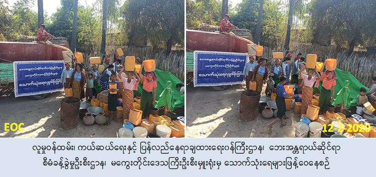 လူမှုဝန်ထမ်း၊ ကယ်ဆယ်ရေးနှင့် ပြန်လည်နေရာချထားရေး၀န်ကြီးဌာန၊ ဘေးအန္တရာယ်ဆိုင်ရာ စီမံခန့်ခွဲမှုဦးစီးဌာန၊ မကွေးတိုင်းဒေသကြီးဦးစီးမှူးရုံးမှ တာဝန်ရှိသူများသည် သောက်သုံးရေ ရှားပါးမှုအခက်အခဲနှင့် ကြုံတွေ့နေရသော မကွေးမြို့နယ် ၊ကြာကန်ကျေးရွာအုပ်စု၊ ဒေါ်ကျင် ထွေး (တဲတိုက်)၊ ရွာအရှေ့ပိုင်းရှိ ကျေးရွာနေပြည်သူ အိမ်ခြေ (၁၁၇) လုံး၊ အိမ်ထောင် စု (၁၂၃) စု၊ လူဦးရေ (၅၈၅) ဦးတို့အတွက် သောက်သုံးရေဂါလံ (၆၀၀၀) အား ( ၁၂- ၂-၂၀၂၀) ရက်နေ့ ( ၁၁ : ၃၀ ) နာရီအချိန်တွင် ကျေးရွာအရောက် သွားရောက်ဖြန့်ဝေပေးခဲ့ပါကြောင်း သတင်း ရရှိပါသည်။