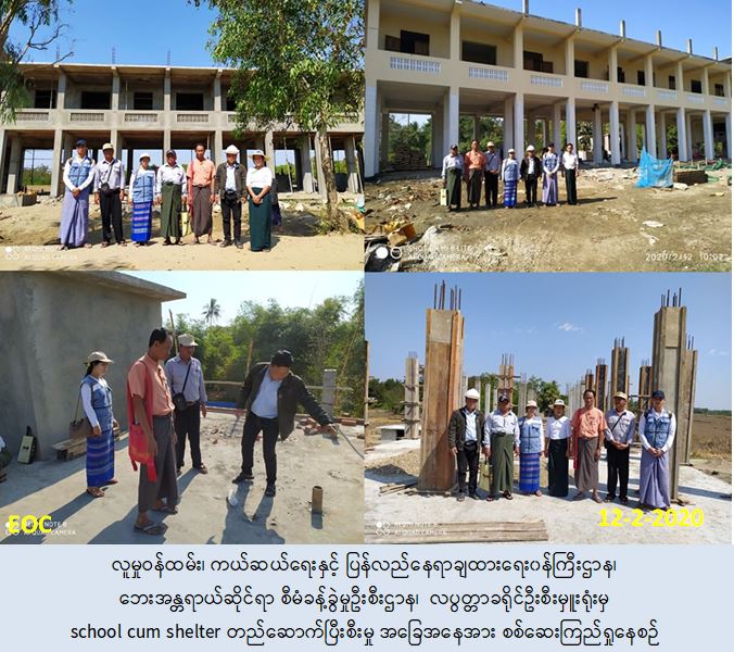 လူမှုဝန်ထမ်း၊ ကယ်ဆယ်ရေးနှင့် ပြန်လည်နေရာချထားရေး၀န်ကြီးဌာန၊ ဘေးအန္တရာယ်ဆိုင်ရာ စီမံခန့်ခွဲမှုဦးစီးဌာန၊ လပွတ္တာခရိုင်ဦးစီးမှူးရုံးမှ တာဝန်ရှိသူများသည်(၁၂-၂-၂၀၂၀) ရက်နေ့တွင် မြို့နယ်ဆောက်လုပ်ရေး ကြီးကြပ်မှုကော်မတီအဖွဲ့၊ လွှတ်တော်ကိုယ်စားလှယ် ရုံးအဖွဲ့တို့နှင့် အတူ အမျိုးသား သဘာဝဘေးအန္တရာယ်ဆိုင်ရာ စီမံခန့်ခွဲမှုကော်မတီ၏ ရန်ပုံငွေဖြင့် Excellent Unity ကုမ္ပဏီမှ တာဝန်ယူတည်ဆောက်လျက်ရှိသော လပွလပွတ္တာမြို့နယ်၊ ဆားချက်ကျေးရွာ အုပ်စု၊ ဆားချက်ကျေးရွာနှင့်တာလူဖလောကျေးရွာတို့မှ school cum shelter တည်ဆောက်မှု ၇၅% တည်ဆောက်ပြီးစီးမှုအခြေအနေနှင့် ဘိုသင်ကုန်းကျေးရွာမှ ၅၀% တည်ဆောက် ပြီးစီးမှုအခြေအနေအား သွားရောက်စစ်ဆေးခဲ့ကြောင်းသတင်းရရှိပါသည်။