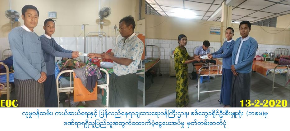 လူမှုဝန်ထမ်း၊ ကယ်ဆယ်ရေးနှင့်ပြန်လည်နေရာချထားရေး၀န်ကြီးဌာန၊ ဘေးအန္တရာယ်ဆိုင်ရာစီမံ ခန့်ခွဲမှုဦးစီးဌာန၊ စစ်တွေခရိုင်ဦးစီးမှူးရုံးမှ တာဝန်ရှိသူများသည် (၁၁-၂-၂၀၂၀) ရက်နေ့တွင် ကျောက်တော်မြို့နယ်၊ မျောက်တောင်ကျေးရွာမှ လက်နက်ကြီးကျည်ထိမှန်မှုကြောင့် စစ်တွေမြို့၊ ပြည်သူ့ဆေးရုံကြီးသို့ ဆေးကုသမှုခံယူရန်ရောက်ရှိလာသည့် ဒဏ်ရာရရှိသူ(၂)ဦးအတွက် ဒဏ်ရာရ ထောက်ပံ့ငွေ(၁၀၀၀၀၀/-)ကျပ်အား (၁၃-၂-၂၀၂၀)ရက်တွင် ထောက်ပံ့ပေးအပ်ခဲ့ပါကြောင်း သတင်းရရှိပါသည်။
