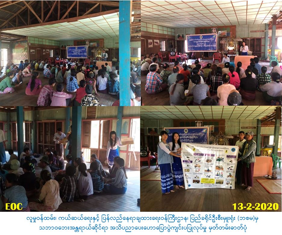 လူမှုဝန်ထမ်း၊ ကယ်ဆယ်ရေးနှင့် ပြန်လည်နေရာချထားရေးဝန်ကြီးဌာန၊ ဘေးအန္တရာယ်ဆိုင်ရာစီမံ ခန့်ခွဲမှုဦးစီးဌာန၊ ပြည်ခရိုင်ဦးစီးမှူးရုံးမှတာဝန်ရှိသူများသည် (၁၃-၂-၂၀၂၀)ရက်နေ့၊ (၁၄:၃၀) နာရီ မှ (၁၅:၃၀) နာရီအချိန်အထိ ပြည်ခရိုင်၊ ပေါက်ခေါင်းမြို့နယ်၊ ညောင်ဝန်းကျေးရွာအုပ်စု၊ ညောင်ဝန်း ကျေးရွာ၊ ရွာဦးကျောင်းဓမ္မာရုံ၌ သဘာဝဘေးအန္တရာယ်နှင့်စပ်လျဉ်း၍ အသိပညာပေးဟောပြော ဆွေးနွေးခြင်း၊ နံရံကပ်ပိုစတာများပေးအပ်ခြင်း၊ လက်ကမ်းစာစောင်များပေးဝေခြင်း၊ ခေါက်ဆွဲ ခြောက်နှင့် သကြားလုံးများ ပေးဝေခြင်းတို့ဆောင်ရွက်ခဲ့ရာ ကျေးရွာသူ/သားများ စုစုပေါင်း(၁၅၀) ဦးခန့်တက်ရောက်ခဲ့ပါကြောင်း သတင်းရရှိပါသည်။