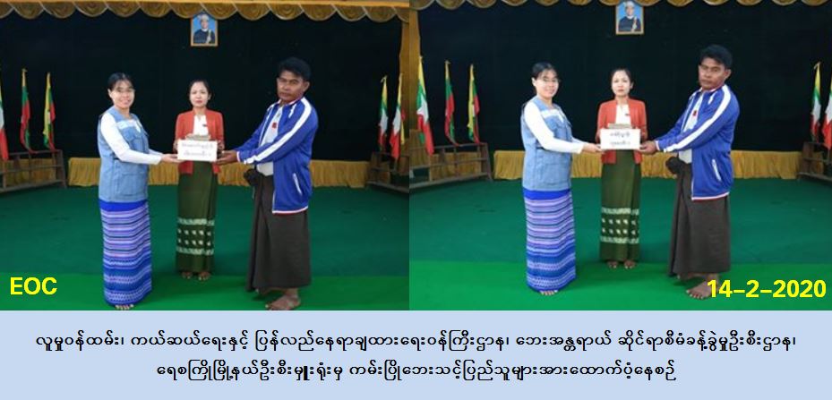 လူမှု၀န်ထမ်း၊ ကယ်ဆယ်ရေးနှင့် ပြန်လည်နေရာချထားရေး၀န်ကြီးဌာန၊ ဘေးအန္တရာယ် ဆိုင်ရာစီမံခန့်ခွဲမှုဦးစီးဌာန၊ ရေစကြိုမြို့နယ်ဦးစီးမှူးရုံးမှ တာဝန်ရှိသူများသည် ( ၁၄-၂-၂၀၂၀) ရက်နေ့တွင် ချင်တွင်းမြစ်ရေတိုက်းစားမှုကြောင့် နွယ်နီကျေးရွာအုပ်စု၊ နွယ်နီကျွန်း ကျေးရွာတွင် ကမ်းပြိုဘေးသင့်ဖြစ်ပွားခဲ့ရာ အိမ်ခြေ (၆) လုံး ၊ အိမ်ထောင်စု (၆) စု ၊ လူဦးရေ (၂၈) ဦးတို့အတွက် အိမ်ဆောက်ပစ္စည်းဖိုးထောက်ပံ့ငွေ (၆၀၀,၀၀၀/-) ကျပ် နှင့် ဆန်ရိက္ခာဖိုးထောက်ပံ့ငွေ (၅၈,၈၀၀/-) ကျပ် ၊စုစုပေါင်း ( ၆၅၈၈၀၀/-) ကျပ်တို့အား (၁၄-၂-၂၀၂၀) ရက်နေ့၊ (၁၅:၀၀) နာရီအချိန်တွင် မြို့နယ်အထွေထွေအုပ်ချုပ်ရေးဦးစီးဌာန ၊ အစည်းအဝေးခန်းမ၌ နွယ်နီကျေးရွာအုပ်ချုပ်ရေးမှူးထံသို့ လွှဲပြောင်းထောက်ပံ့ပေးအပ်ခဲ့ ကြောင်းသတင်းရရှိပါသည်။
