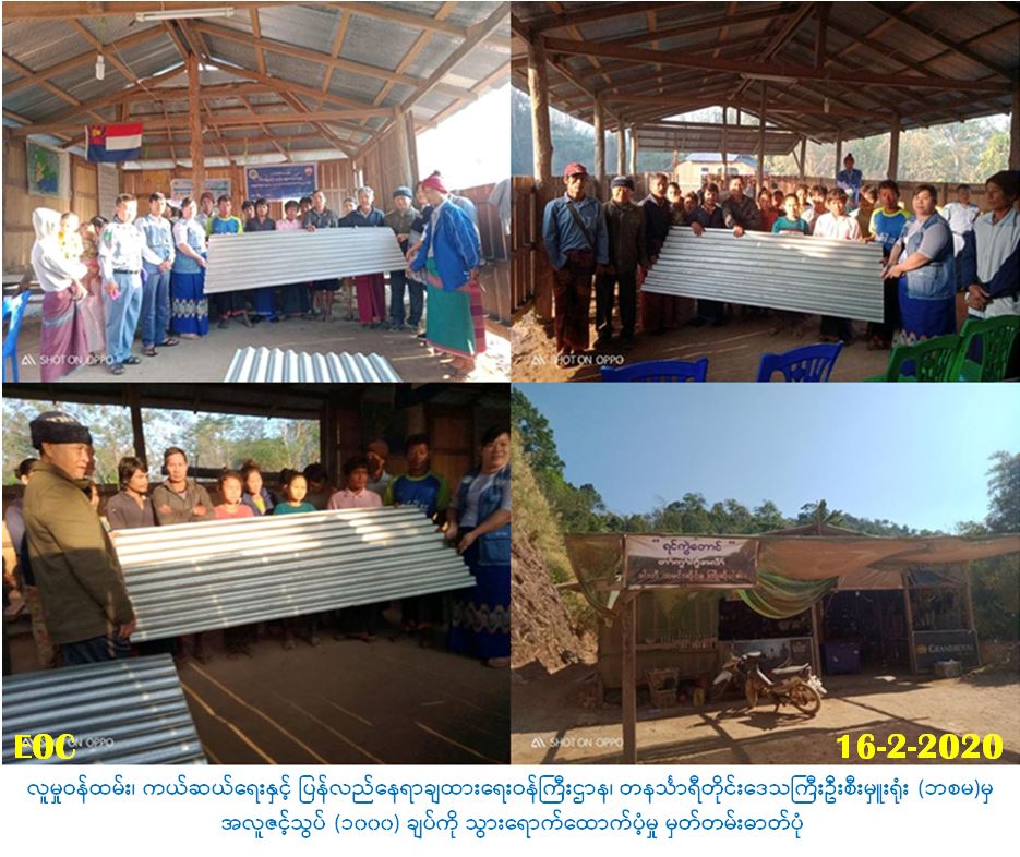 လူမှုဝန်ထမ်း၊ ကယ်ဆယ်ရေးနှင့် ပြန်လည်နေရာချထားရေးဝန်ကြီးဌာန၊ ဘေးအန္တရာယ်ဆိုင်ရာစီမံ ခန့်ခွဲမှုဦးစီးဌာန၊ တနင်္သာရီတိုင်းဒေသကြီးဦးစီးမှူးရုံးမှ တာဝန်ရှိသူများသည်(၁၆-၂-၂၀၂၀) ရက်နေ့၊ (၁၅:၀၀) နာရီအချိန်တွင် တနင်္သာရီတိုင်းဒေသကြီးအစိုးရအဖွဲ့၊ တိုင်းရင်းသားရေးရာ၀န်ကြီး ဦးစောလုကာဦးဆောင်သော အဖွဲ့နှင့်အတူ အမြားကျေးရွာအုပ်စု၊ ကျေးရွာ (၇) ရွာရှိ အိမ်ထောင်စု များအတွက် အလူဇင့်သွပ် (၁၀၀၀) ချပ်ကို သွားရောက်ထောက်ပံ့ခဲ့ပါကြောင်း သတင်းရရှိပါသည်။