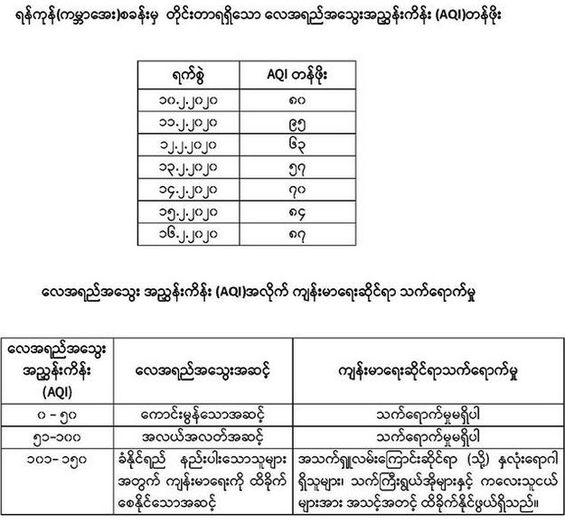 (၁၀-၂-၂၀၂၀) ရက်နေ့မှ (၁၆-၂-၂၀၂၀) ရက်နေ့အထိ မိုးလေဝသနှင့်ဇလဗေဒညွန်ကြားမှုဦးစီးဌာန၊ ရန်ကုန်(ကမ္ဘာအေး)စခန်းက နေ့စဉ်တိုင်းတာရရှိသည့် လေအရည်အသွေး (PM2.5) အခြေအနေများကို ဖော်ပြထားပါသည်။