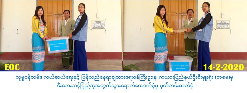 လူမှုဝန်ထမ်း၊ ကယ်ဆယ်ရေးနှင့် ပြန်လည်နေရာချထားရေးဝန်ကြီးဌာန၊ ဘေးအန္တရာယ်ဆိုင်ရာစီမံ ခန့်ခွဲမှုဦးစီးဌာန၊ ကယားပြည်နယ်ဦးစီးမှူးရုံးမှ တာဝန်ရှိသူများသည်(၆-၂-၂၀၂၀)ရက်နေ့တွင် ကယားပြည်နယ်၊ လွိုင်ကော်ခရိုင်၊ လွိုင်ကော်မြို့၊ နမ့်ဘောဝမ်(က)ရက်ကွက်ရှိ ခရိုင်ရေအရင်းအမြစ် အသုံးချရေးဦးစီးဌာနပိုင်ဝန်ထမ်းအိမ်ရာအတွင်း လျှပ်စစ်ထမင်း ပေါင်းအိုးတည်ရာမှ မီးကူးစက် လောင်ကျွမ်းခဲ့ပြီး (၃၆×၁၈)ပေ၊ ပျဉ်ကာ၊ သွပ်မိုး၊ မြေစိုက်(၂)ခန်းတွဲ(၁)ထပ်နေအိမ်(၁)လုံး မီးလောင် ကျွမ်းခဲ့ရာဘေးသင့်အိမ်ထောင်(၁)စု၊လူဦးရေ(၁)ဦးအတွက် ကယ်ဆယ်ရေးပစ္စည်း(၁၉) မျိုး (၁) အိမ် ထောင်စာနှင့် (၇)ရက်စာ ဆန်ရိက္ခာဖိုးထောက်ပံ့ငွေ (၂၁၀၀/-)ကျပ်၊ ရန်ပုံငွေစုစုပေါင်း (၂၁၀၀/-) ကျပ်တို့အား (၁၄-၂-၂၀၂၀) ရက်နေ့၊ (၁၂:၀၀)နာရီအချိန်တွင် သွားရောက်ထောက်ပံ့ခဲ့ပါသည်။