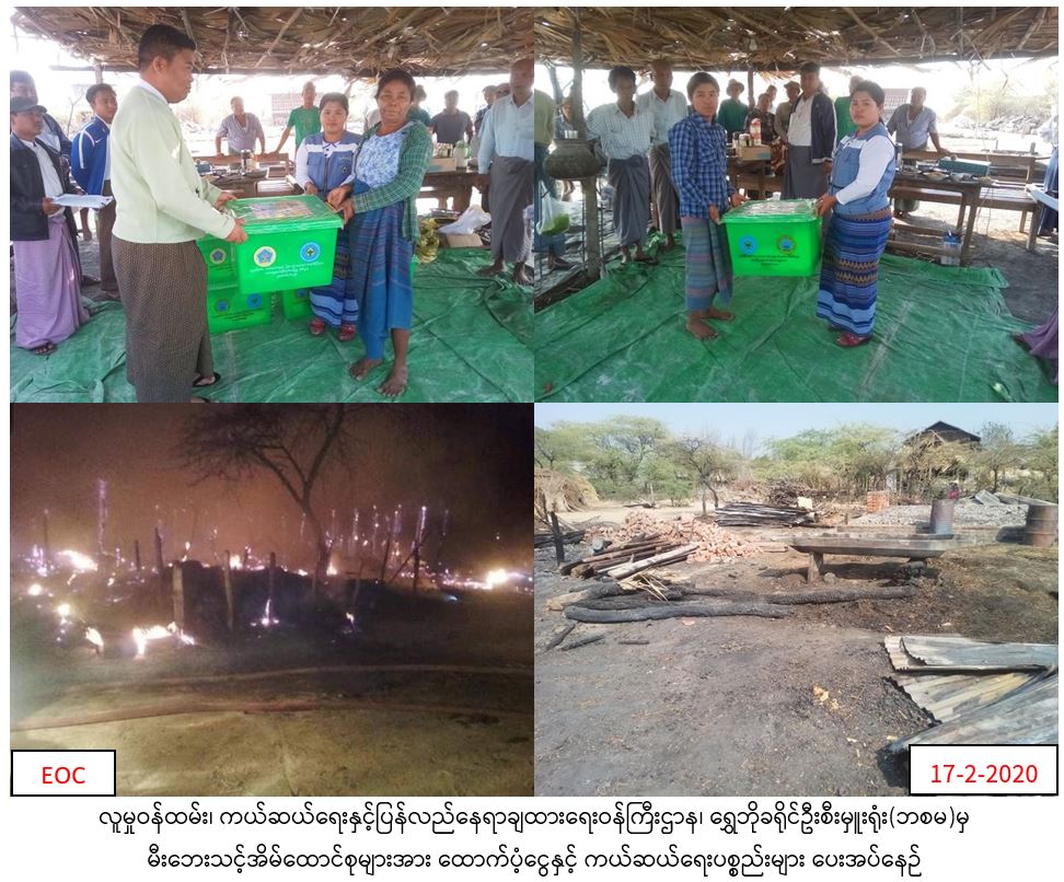 လူမှုဝန်ထမ်း၊ ကယ်ဆယ်ရေးနှင့်ပြန်လည်နေရာချထားရေးဝန်ကြီးဌာန၊ ဘေးအန္တရာယ်ဆိုင်ရာစီမံခန့်ခွဲမှုဦးစီးဌာန၊ ရွေဘိုခရိုင်ဦးစီးမှူးရုံးမှ တာဝန်ရှိသူများသည် ရွေဘိုခရိုင် ခင်ဦးမြို့နယ် ညောင်ကုန်းကျးရွာ (၁၅-၂-၂၀၂၀)ရက်နေ့တွင် မီးလောင်ကျွမ်းမှုကြောင့် ဘေးသင့်ခဲ့သော မီးဘေးသင့်အိမ်ခြေ (၆ )လုံး၊ အိမ်ထောင်စု( ၆) စုမှလူဦးရေ (၂၅)ဦးအတွက် ဆန်ရိက္ခာဖိုး ထောက်ပံ့ငွေ (၅၂၅၀၀/-)၊ အိမ်ဆောက်ပစ္စည်းဖိုးထောက်ပံ့ငွေ (၆၀၀၀၀၀/-)၊ ဒဏ်ရာရလူနာ(၁)ဦးအတွက် ထောက်ပံ့ငွေ (၅၀၀၀၀ိ/-) စုစုပေါင်းထောက်ပံ့ငွေ (၇၀၂၅၀၀/-)၊ ကယ်ဆယ်ရေးပစ္စည်း ၁၇မျိုး( ၆)အိမ်ထောင်စာတို့အား (၁၇-၂-၂၀၂၀)ရက်နေ့ (၁၅း၃၀)အချိန်တွင် ခင်ဦးမြို့နယ် သဘာဝဘေးအနရာယ်ဆိုင်ရာစီမံခန့်ခွဲမှုကော်မတီအဖွဲ့နှင့်အတူ ဘေးသင့်ဒေသသို့ သွားရောက်ထောက်ပံ့ခဲ့ပါကြောင်း သတင်းရရှိပါသည်။